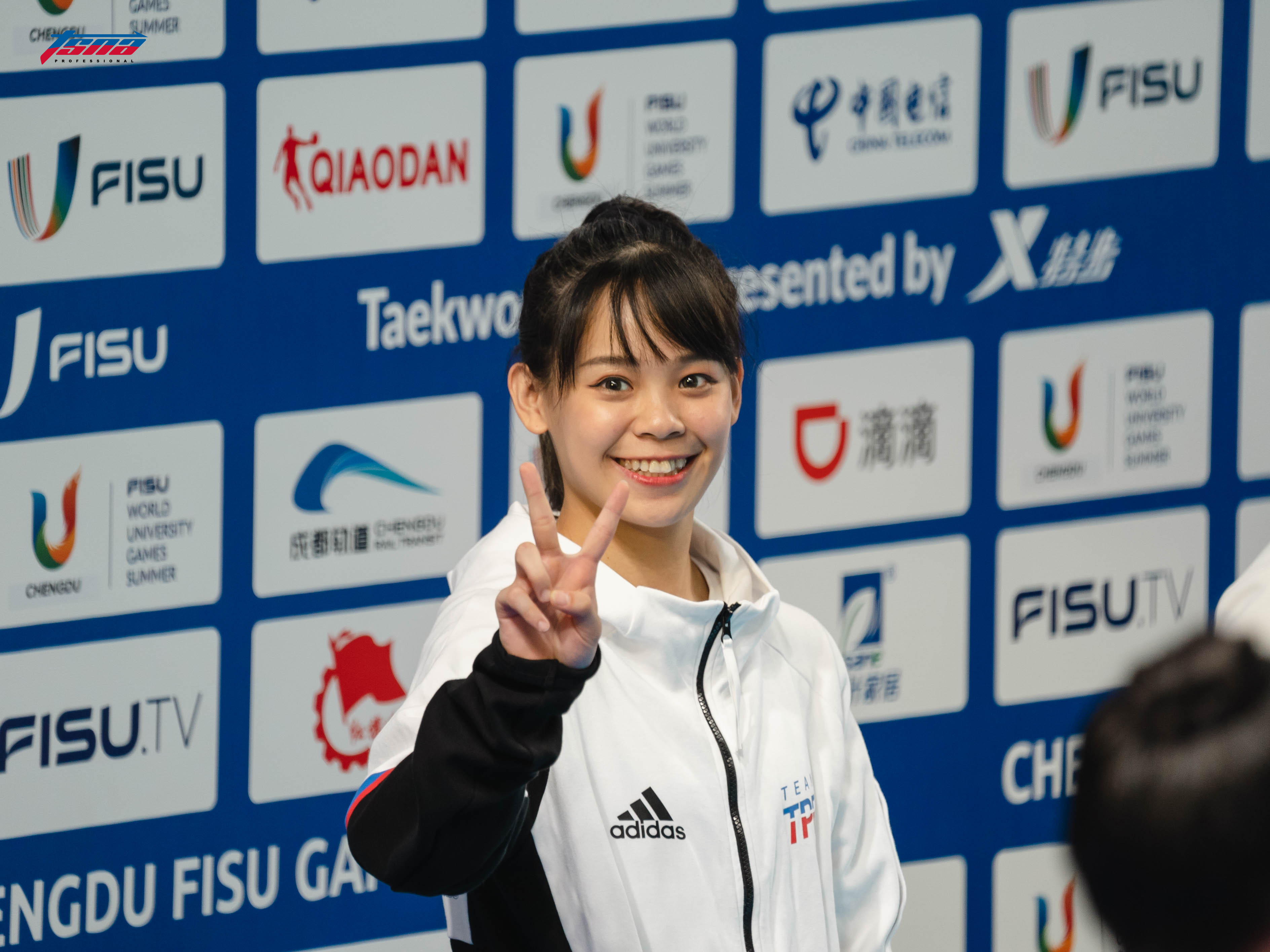 就讀於中國文化大學的她還感謝教練、隊友、觀眾,總之是觀看和應援的所有人:「我練習做空翻動作前都會說『我要走了』,今天比賽前全隊為我加油,做動作前也會在場邊大喊『走了,走了』,加上喜歡被人關注、又有那麼多觀眾,很高興有發揮出來。」