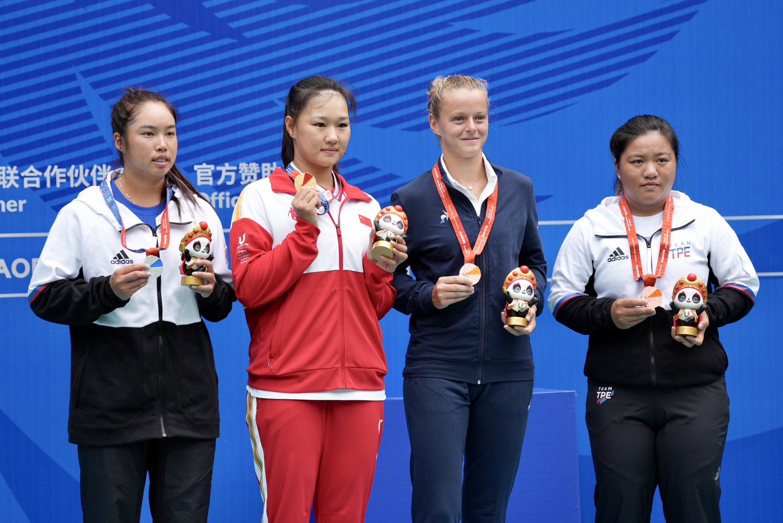 網球女單頒獎台上,左起楊亞依、郭涵煜、法國Alice Robbe、梁恩碩。(劉勁宏/攝)