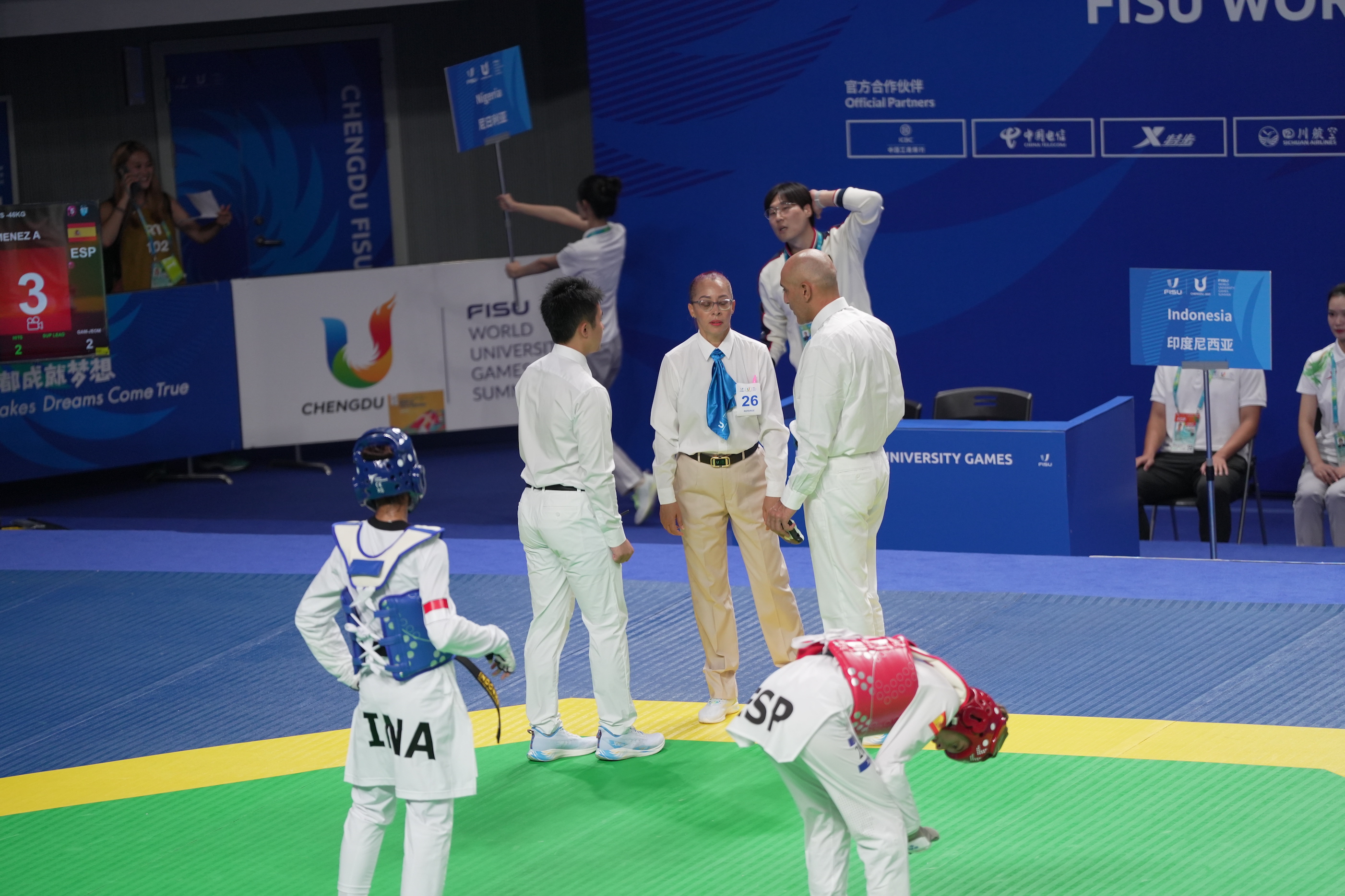 成都世界大學運動會我國除了教練、選手外,也有裁判參與其中,例如李清德、李昆懿,分別擔任跆拳道品勢、對打的國際裁判。李昆懿說,非常感謝有機會可以與各國先進學習,過程中,不僅能提升各方面能力,彼此互動交流,也能讓世界看見台灣之美。