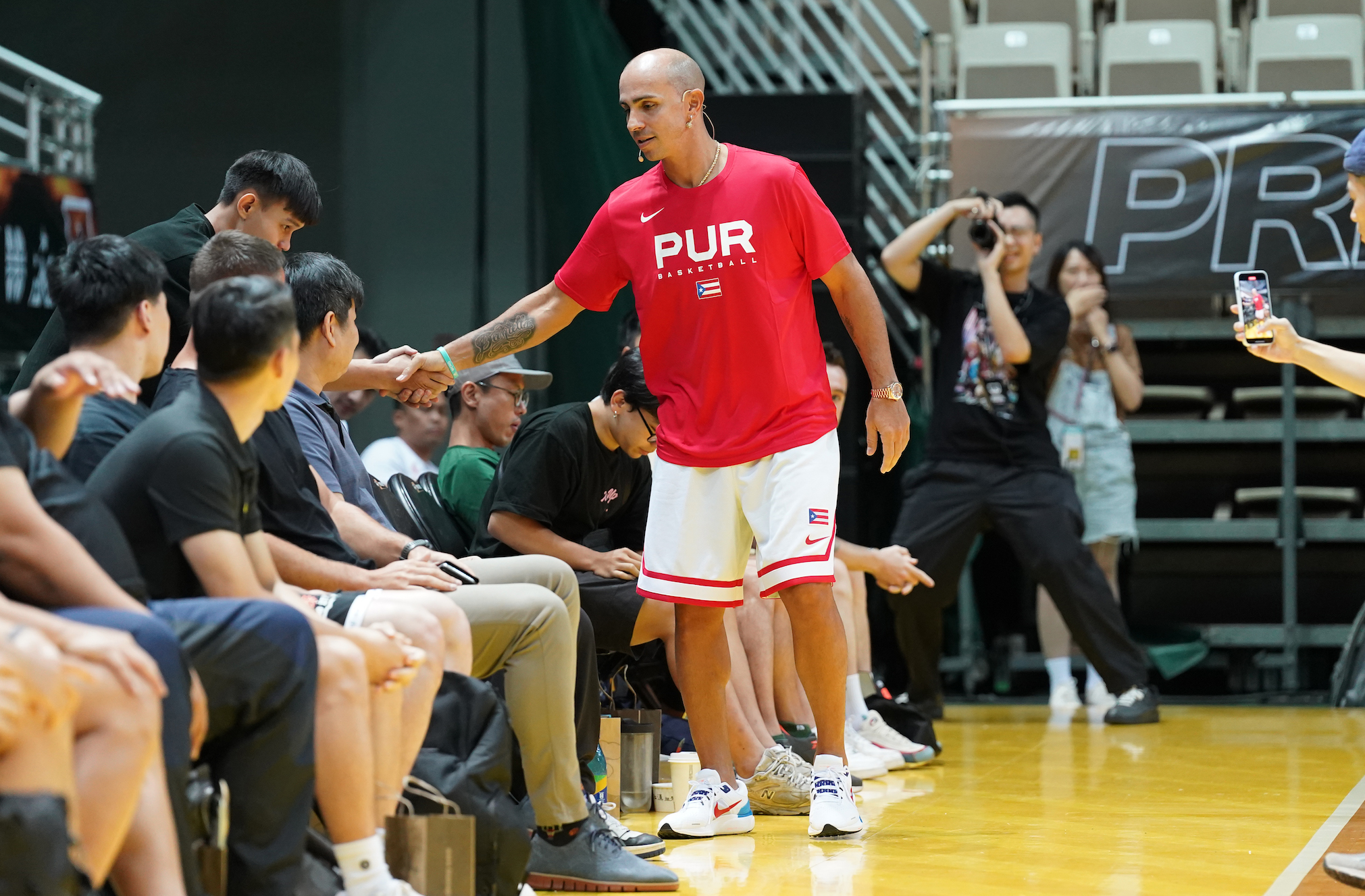 Carlos Arroyo在課前與所有參與研習營的教練握手致意。(T1提供)