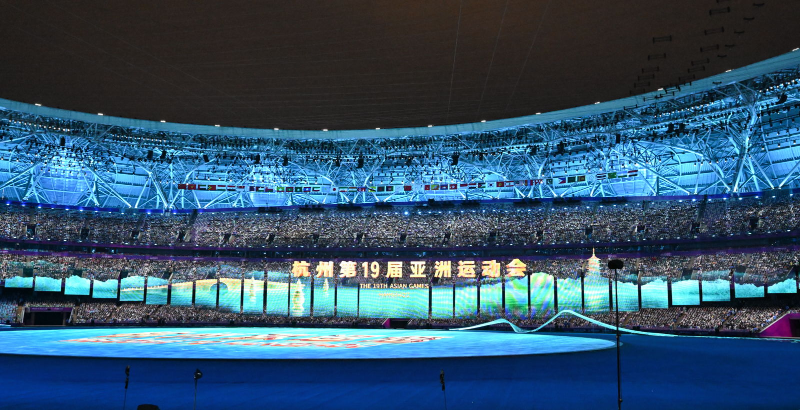 杭州亞運在秋分開幕,以中秋後會達到頂點的錢塘江潮發想,將主題定為「潮起亞細亞」,除江南韻味等地方元素,也透過使用3D雙鋼索、3D投影與AR、AI技術,加上數位煙火、逾1億人線上與現場6名火炬手合點聖火等方式,展現賽會綠色、智能理念。