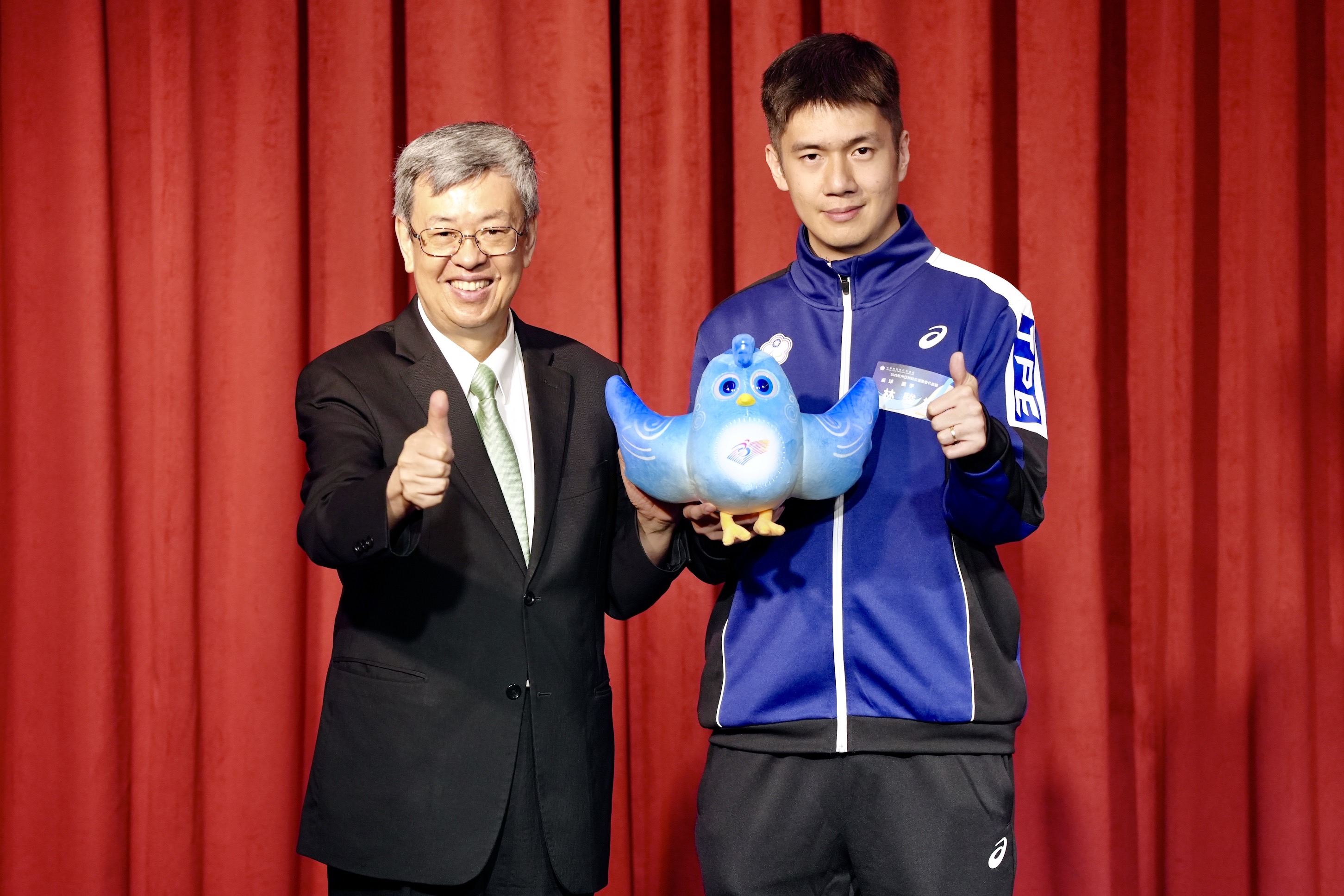桌球選手林駿梃(右)致贈行政院長陳建仁亞帕運吉祥物。(李宇政攝)