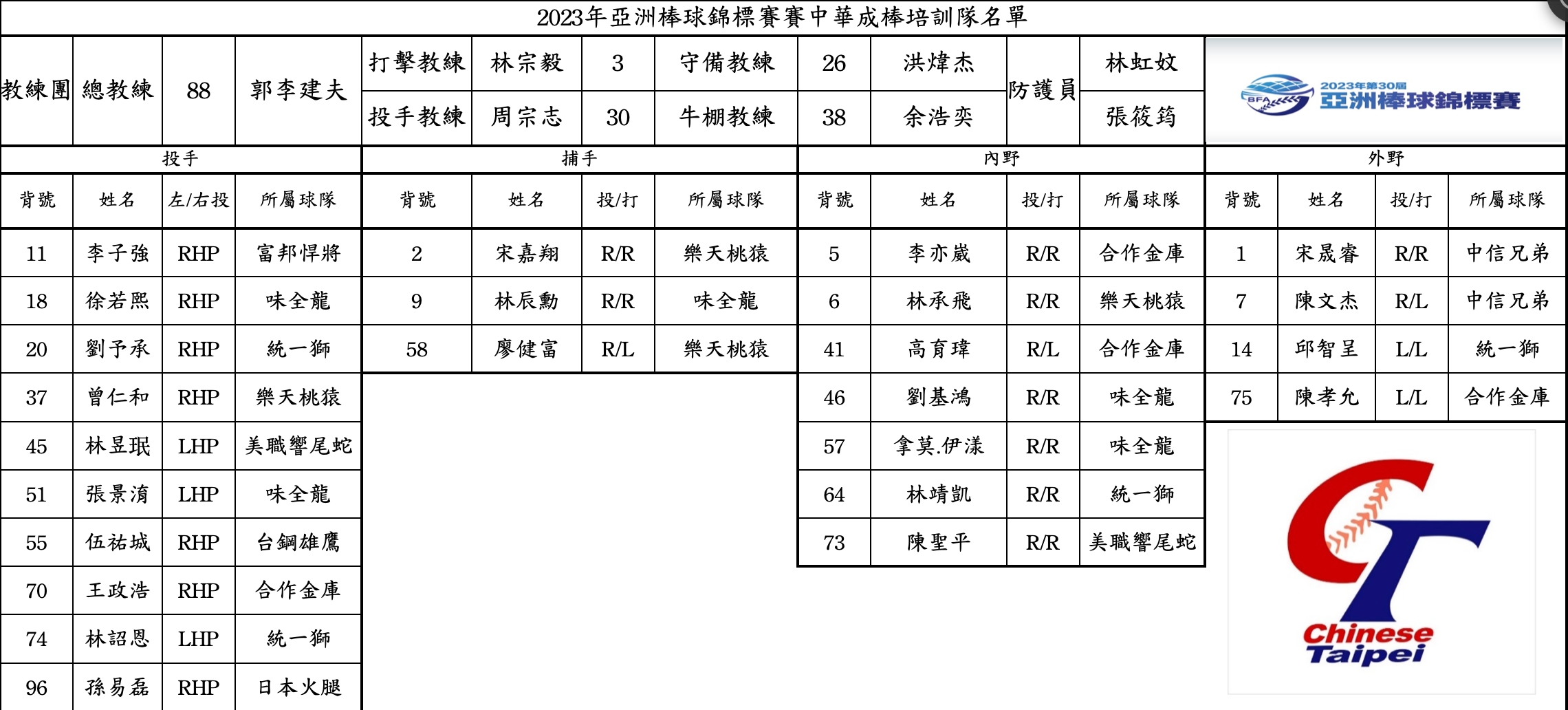2023亞錦賽將於12月在台北開打,也是外界期待大巨蛋啟用後的第一個大型國際賽事,中華棒協今天下午公布賽程與培訓隊24人名單,共有3位旅外選手、4位業餘選手,其餘17人都是中職年輕未來之星。