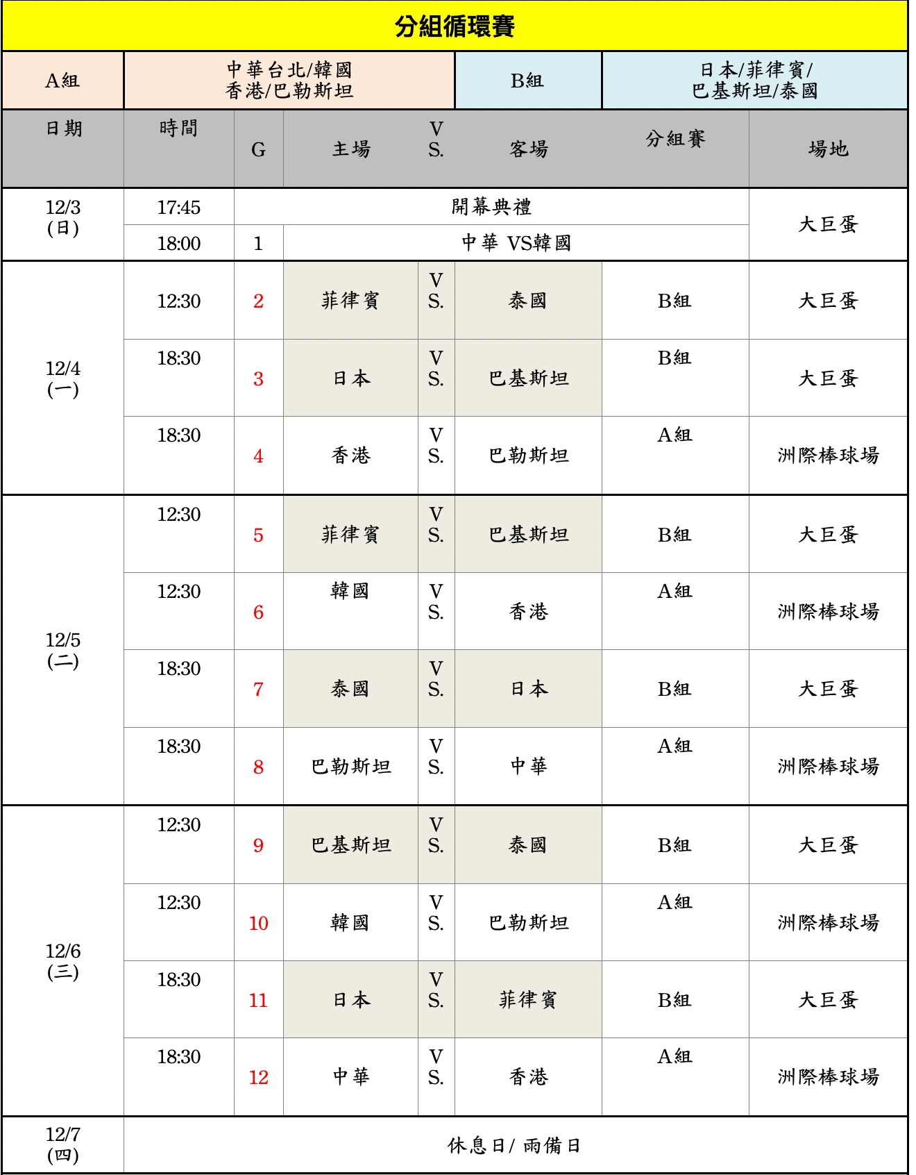中華隊首戰在12月3日晚間對決韓國,也確定是台北大巨蛋啟用後的首場國際正式賽事,之後5日對戰巴勒斯坦賽事則移師洲際棒球場、6日對戰香港一樣在洲際棒球場,預賽中華隊僅有1場比賽在大巨蛋進行。