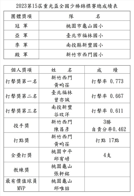 新竹西門在季軍戰以2比5不敵南投新豐,以第4名收場,不過這次投打都有突出表現,黃畇荏打擊率7成73、17打點,拿下打擊與打點獎,陳昌彥3勝,防禦率0.46,拿下投手獎。桃園中平邱宥嵃以4轟拿下全壘打獎。