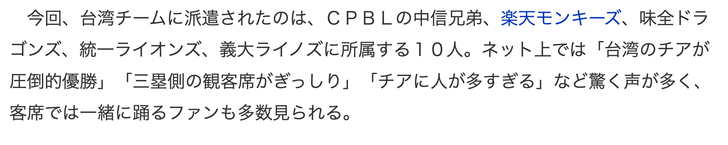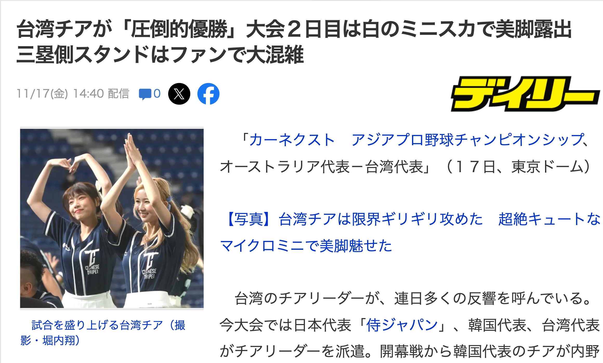 台灣的應援文化獨步全球,今天日媒《Daily》以「台灣啦啦隊壓倒性優勝 穿白色迷你裙露出美腿!球迷擠爆三壘側舞台」為題報導,並且文中指出中華職棒派出5隊的啦啦隊女孩10人作為中華隊啦啦隊陣容,唯一誤植是日媒仍以為其中一隊是「義大犀牛」而非「富邦悍將」。