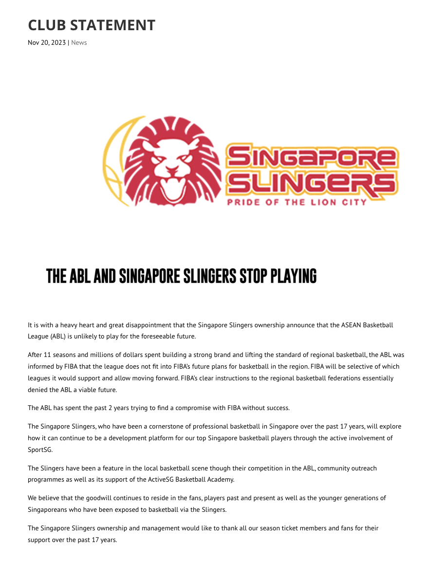 聲明第一句就指出,「新加坡騰飛之獅老闆懷著沉重的心情和極大的失望宣布,東南亞職業籃球聯賽(ABL)在可預見的未來不太可能舉行。」