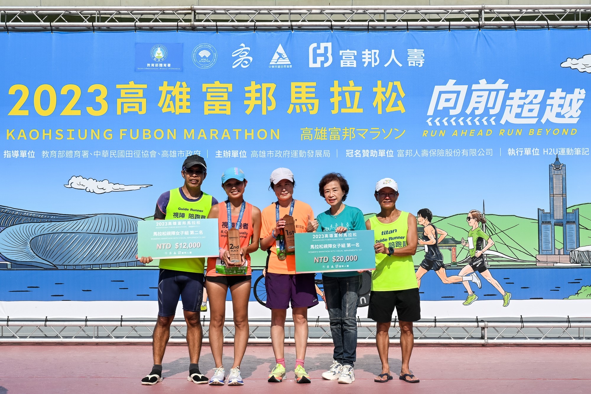 2023高雄富邦馬拉松視障組採男女分組,得名選手與陪跑員上台領獎共享喜悅,由富邦人壽公關廣宣部部長陳姿瑛(右二)頒獎。