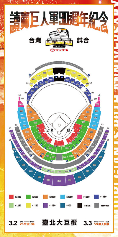 凡購買3380元者,進場後憑票券可獲贈全球獨家「應援法披」。此外,所有購票者都有機會獲得入場贈品「應援小方巾」,限量一萬條。兩項贈品設計都是採用讀賣巨人的代表色「橘色」,運用日式應援團的獨特元素進行設計,結合台北大巨蛋的插圖意象,來為讀賣巨人軍90週年台灣試合留念。兩項贈品皆為賽事限定,只送不賣,相當具有收藏價值!
