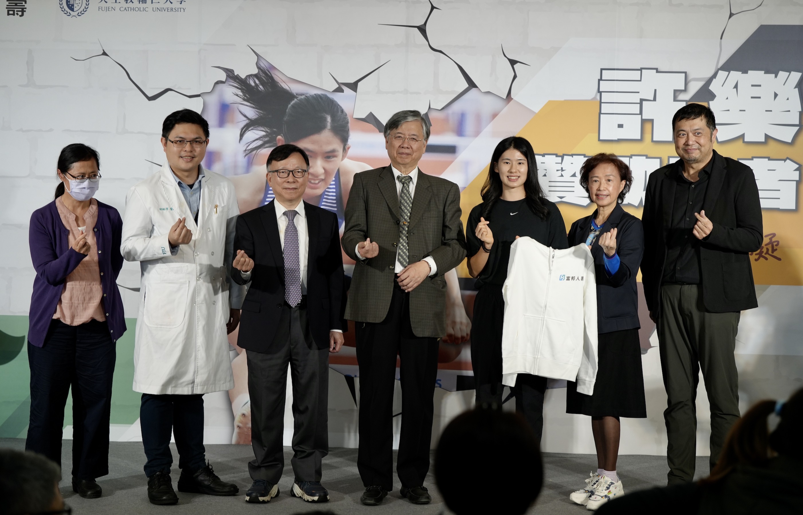 輔大一年級的田徑女將許樂(右3)獲得富邦人壽贊助,記者會在輔大舉行。(李宇政攝)