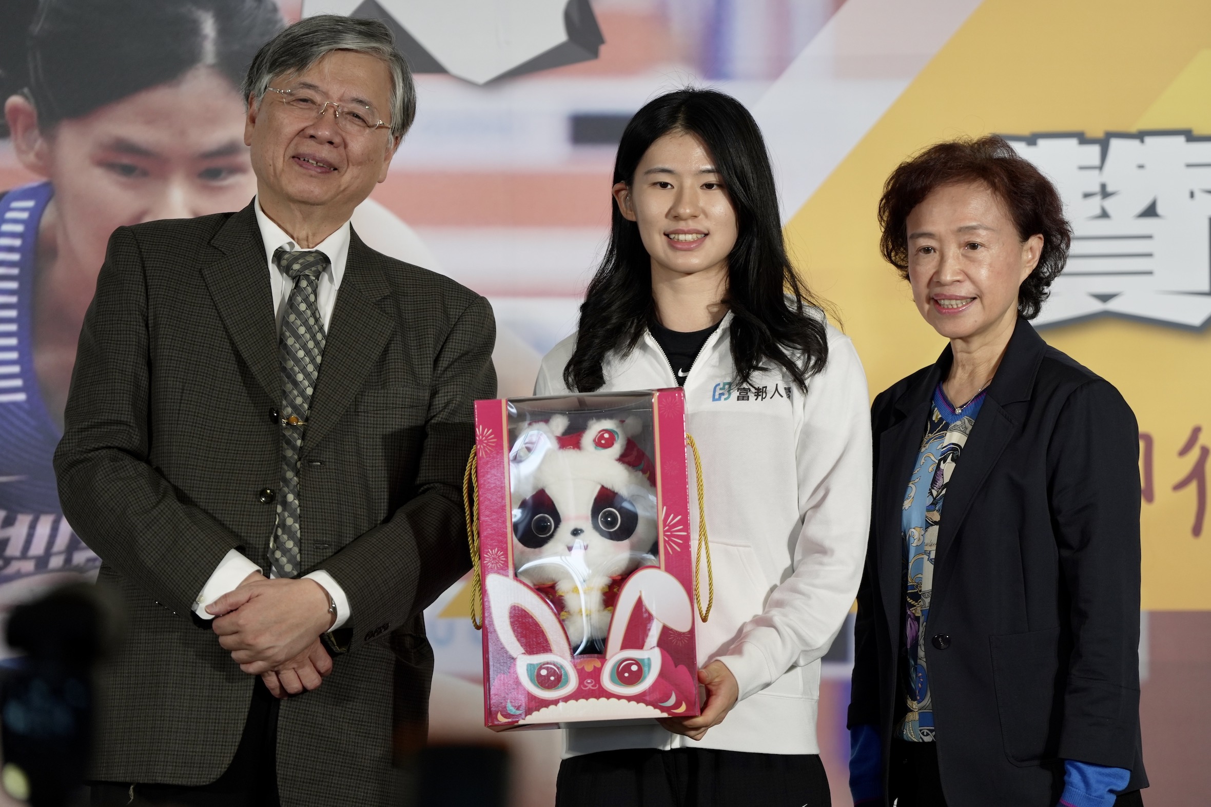 今天記者會上,陳姿瑛為許樂披上象徵富邦人壽贊助的外套,輔大校長江漢聲也致贈許樂成都世大運紀念品。