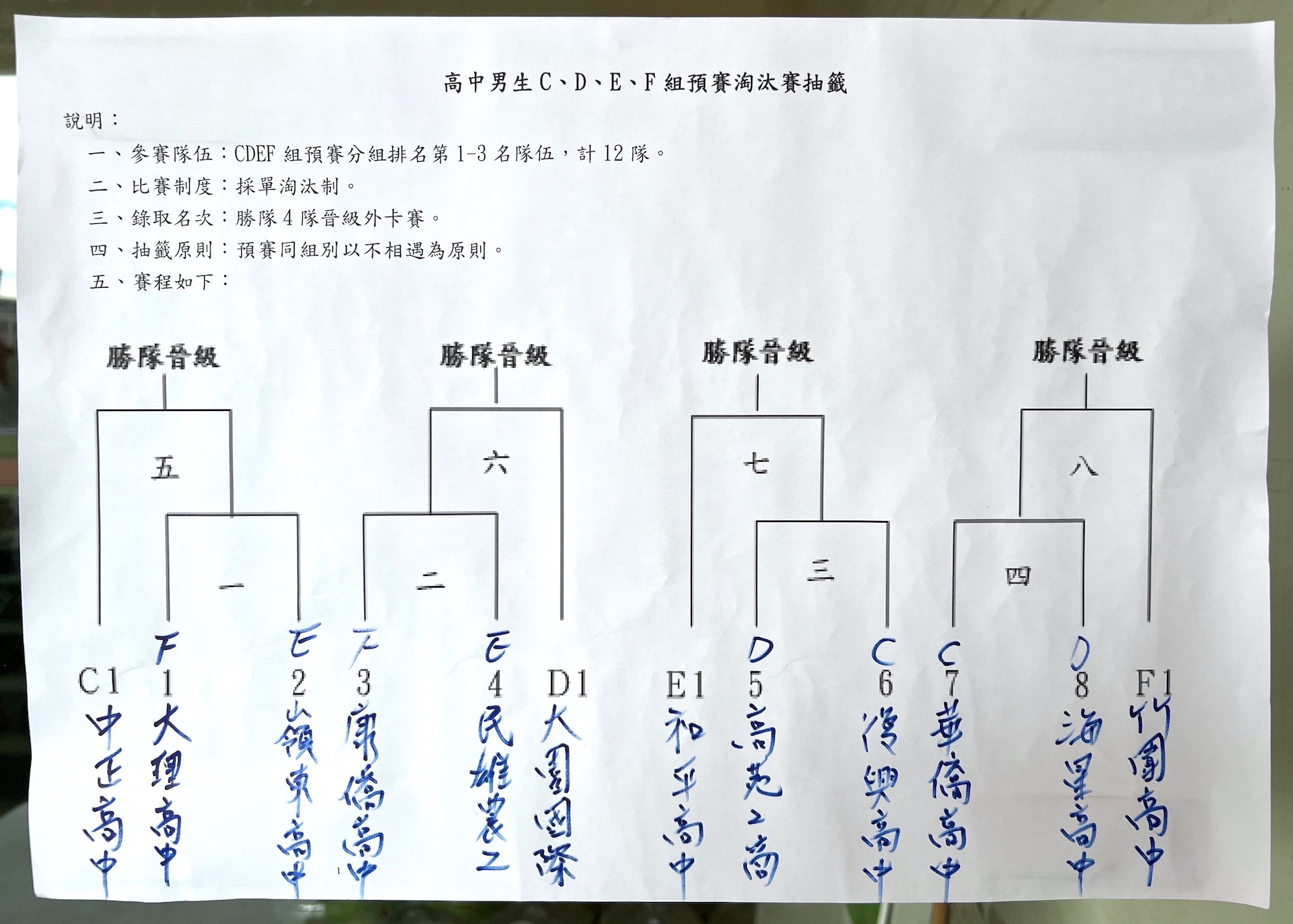 目前A組的5、6名分別是花蓮高農、私立大同;B組的5、6名分別是花蓮高中、中山工商;C、D、E、F組的分組第1目前是中正高中、大園國際、和平高中、竹圍高中。