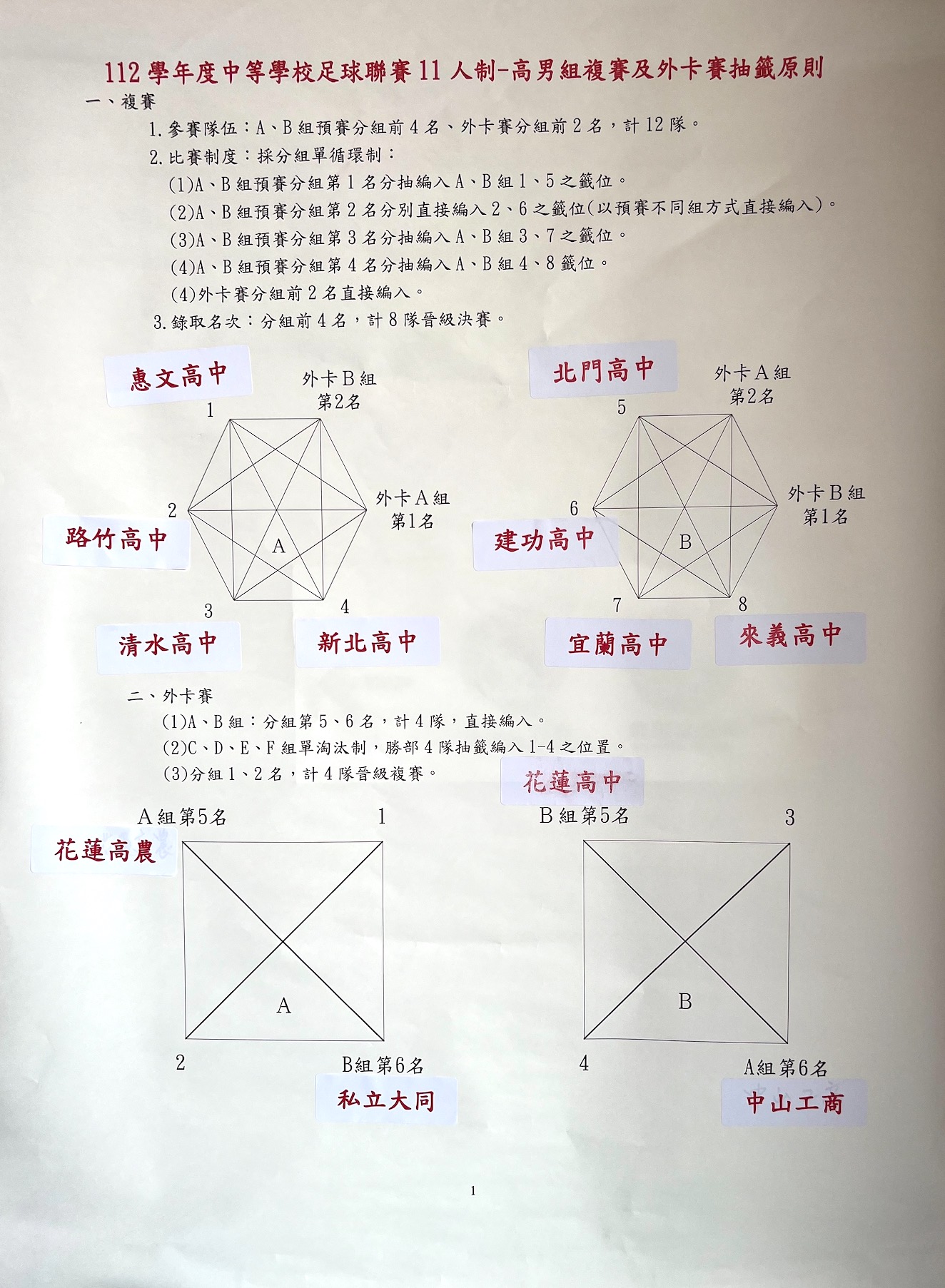 112學年度中等學校足球聯賽(HFL)11人制,高男組預賽第二階段在輔仁大學足球場進行,今天(27日)進行C、D、E、F組淘汰賽抽籤,而A、B組的傳統強隊花蓮高農、花蓮高中落入外卡賽,讓外界感到意外。