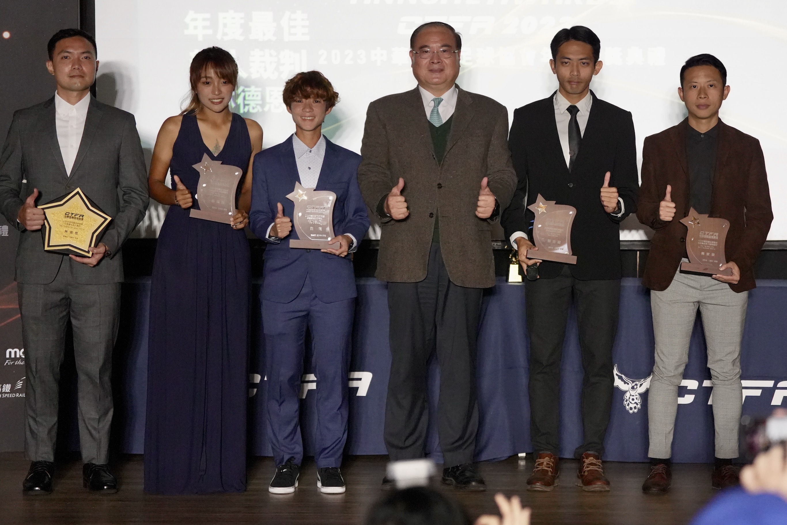 (右起)最佳男子助理裁判陳家豪、最佳男子裁判劉翔紹、台灣運彩副總經理蔡明哲、最佳女子裁判王婕、最佳女子助理裁判楊振艷,最佳新人裁判林德恩。(李宇政攝)