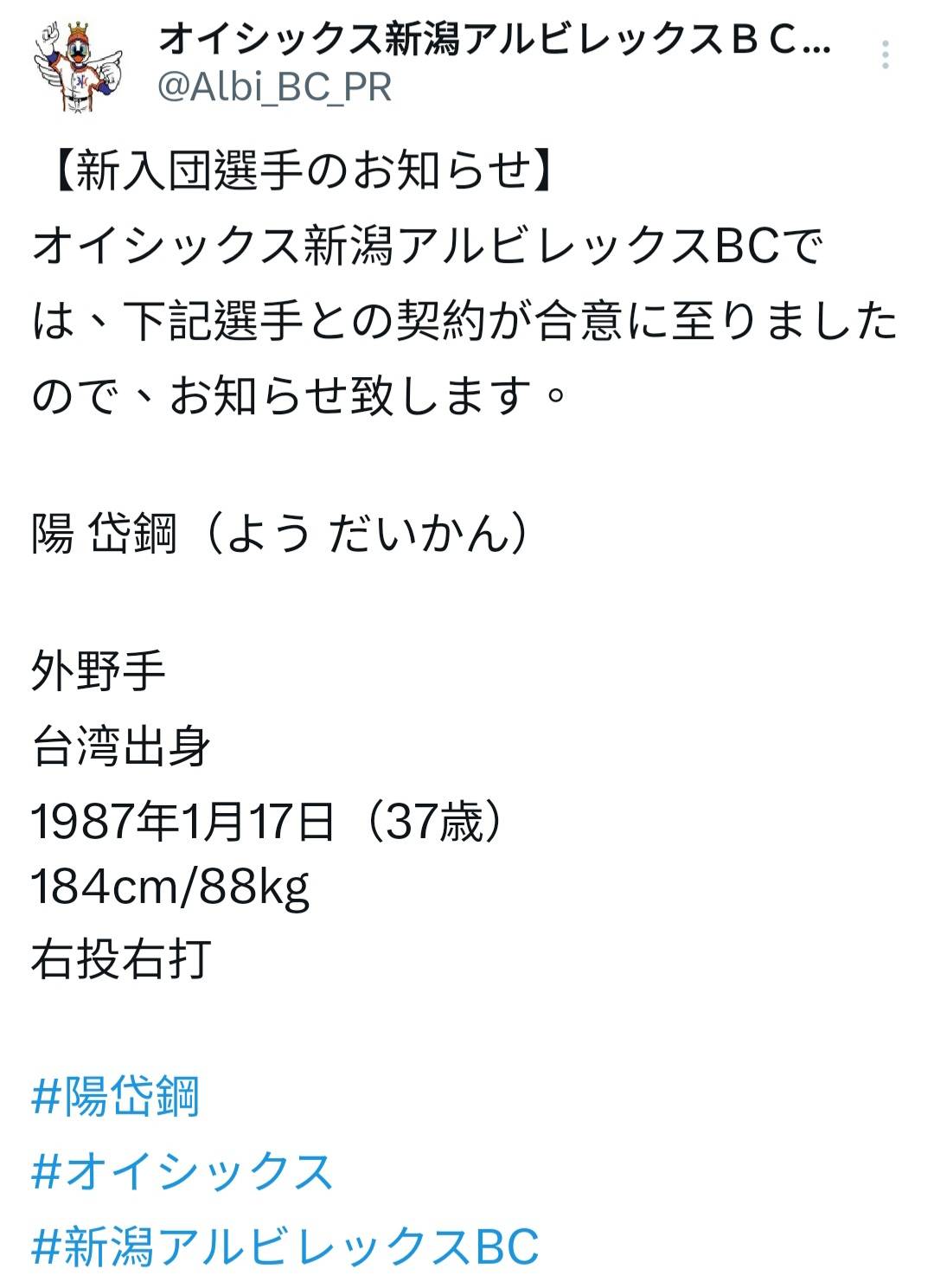 Oisix新潟正式公告陽岱鋼加盟。取自Oisix新潟X(原推特)