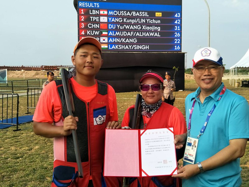 林怡君(中)、楊昆弼(左)長年來都是國內飛靶一姊、一哥,2018年雅加達-巨港亞運2人攜手打下不定向飛靶混合團體銀牌。右為時任、也是現任中華民國射擊協會理事長陳士魁。(資料照,中華奧林匹克委員會提供)