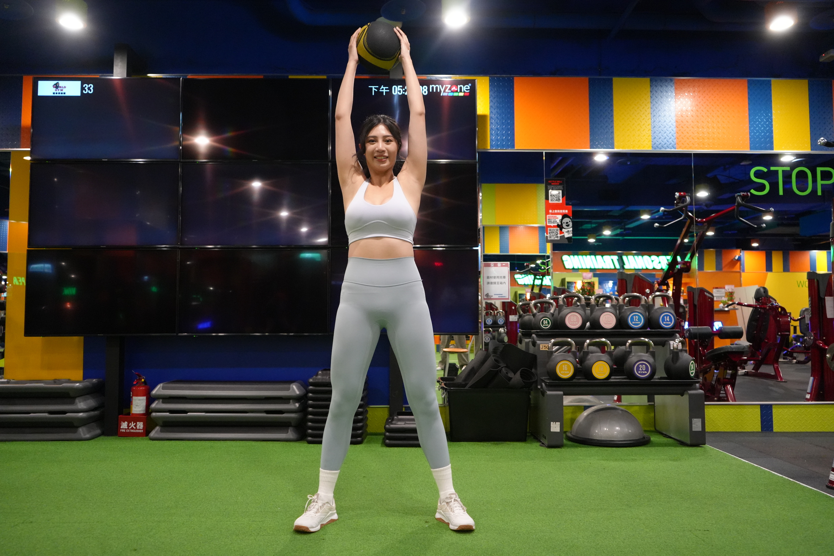 這個動作主要是深蹲加肩推,同時練到上、下肢肌力。
