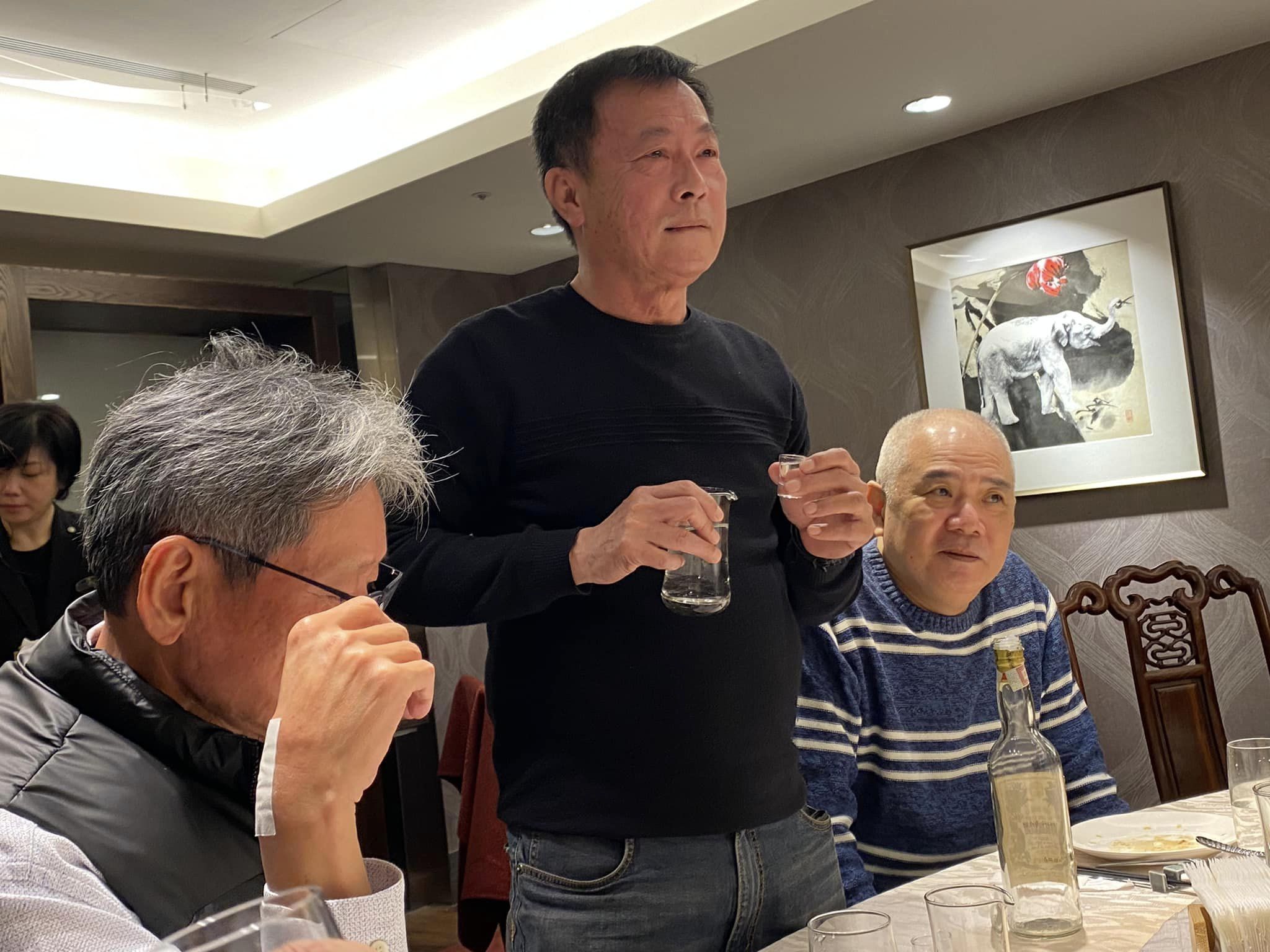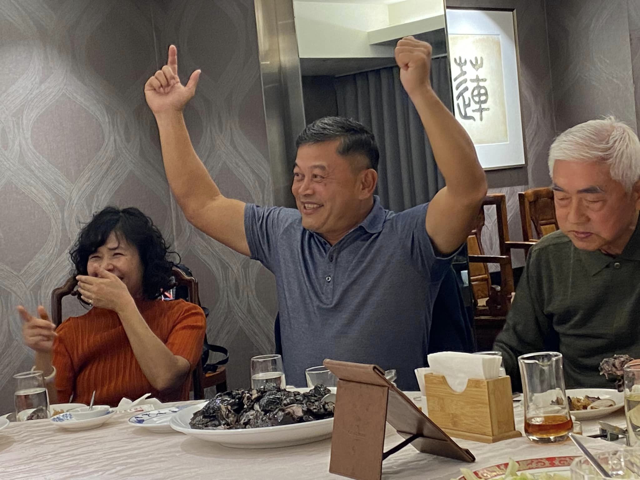 大夥把酒言歡,開心談論著當年榮光與大小糗事,成為1984年奧運國手們的聚會焦點,唯二拿著白開水舉杯的是李居明與杜福明,強調聚餐之後還要開車,拒絕酒駕。