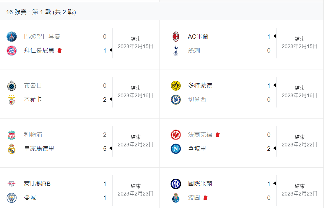 2023歐冠16強淘汰賽第一輪,8場比賽7場2.5小分。