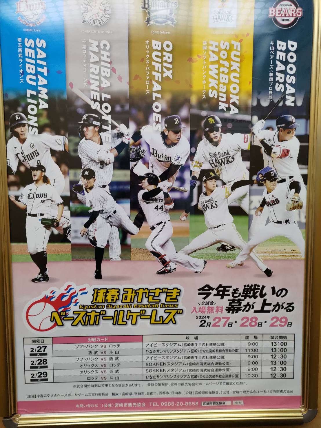 此回隨行台灣媒體下榻飯店就有海報宣傳春訓練習賽,包括軟銀、歐力士、西武獅、千葉羅德與韓國職棒斗山熊在宮崎對戰切磋,今天即便宮崎下雨沒有室內練習,還是有不少球迷到球場看軟銀練球。