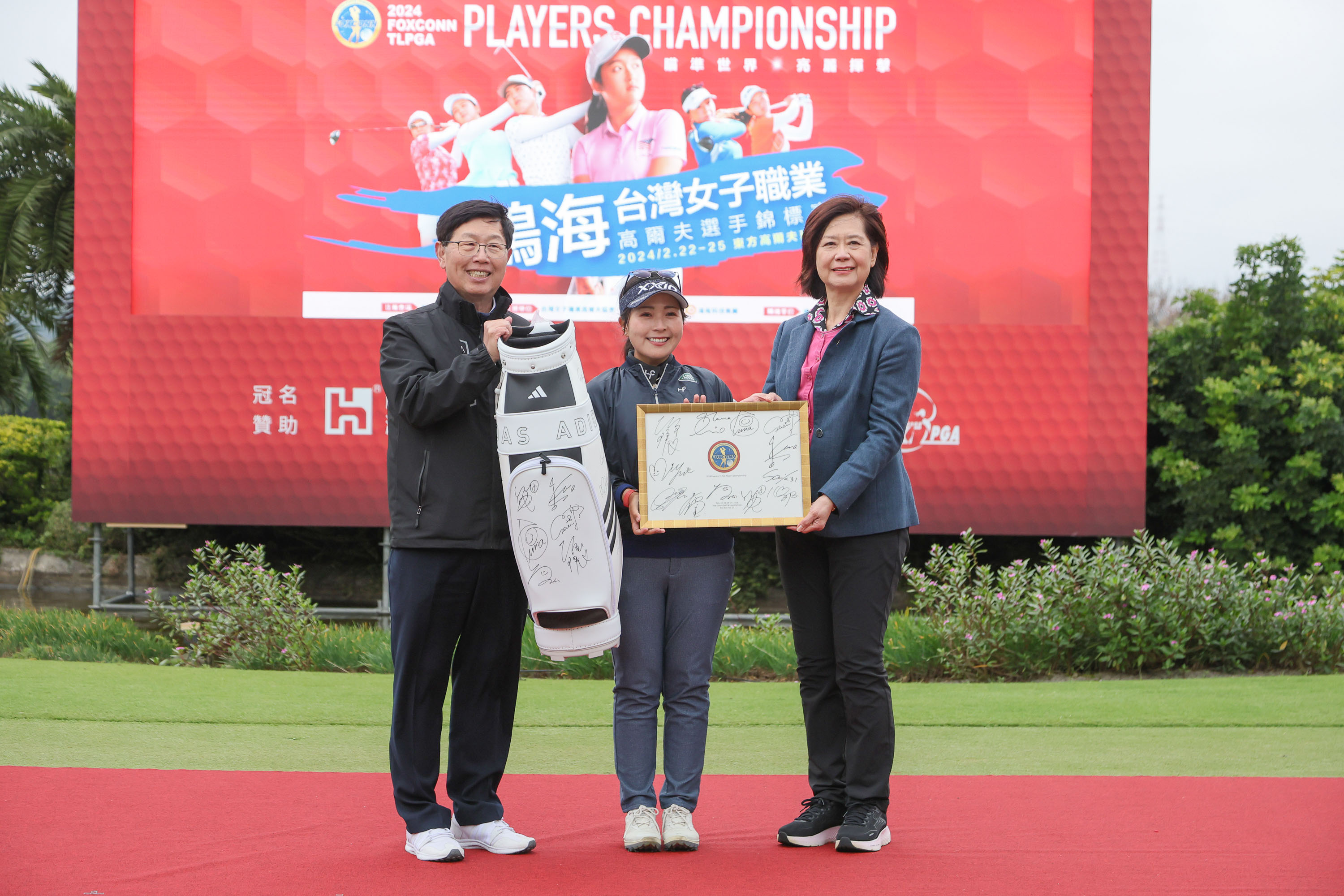 青木瀬令奈(中)代表日本參賽選手分別致贈簽名球袋、簽名板給鴻海科技集團董事長劉揚偉(左)、東方高爾夫俱樂部總經理郭秋琳(右)。(TLPGA提供)