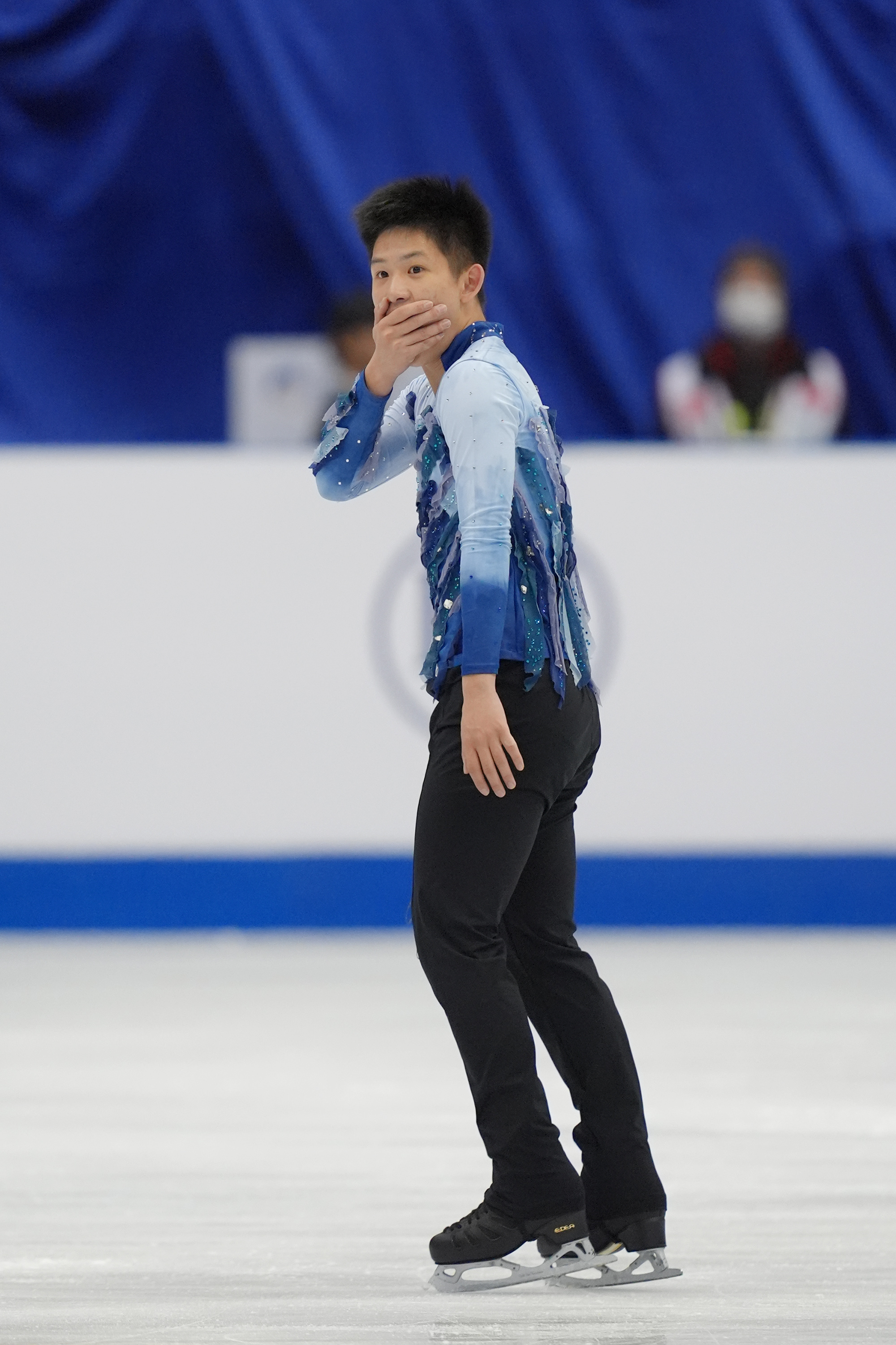 李宇翔完成長曲演出後,對自己表現驚訝,做出摀嘴動作。(中華民國滑冰協會提供)