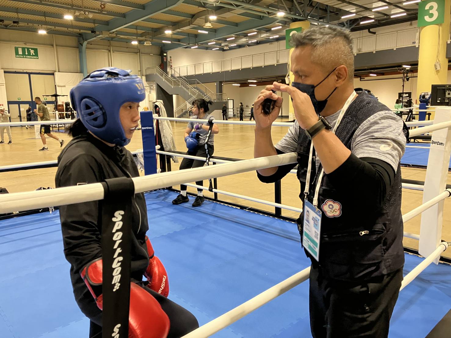 郭怡萱(左)接受教練柯文明指導。(中華民國拳擊協會提供)