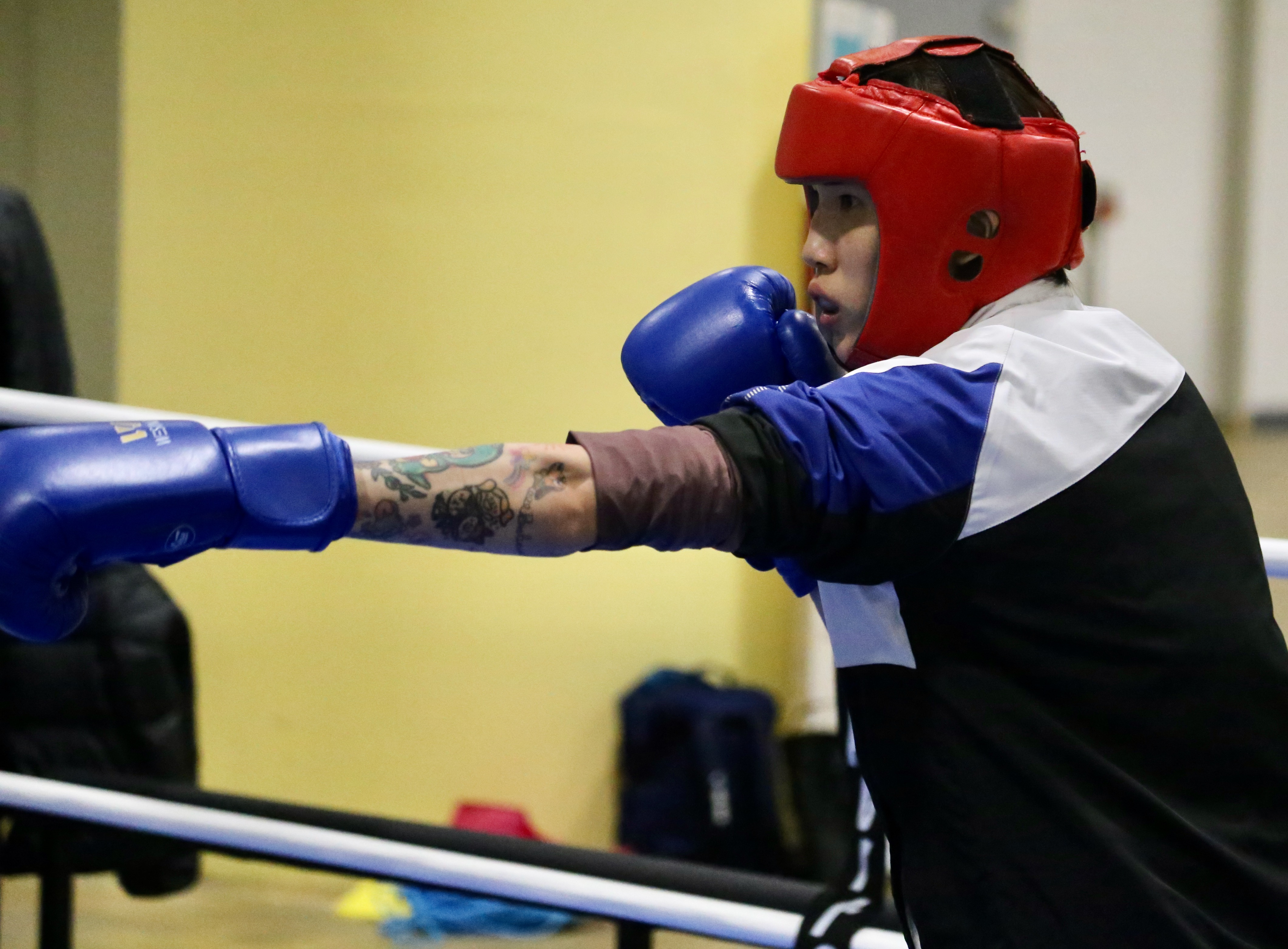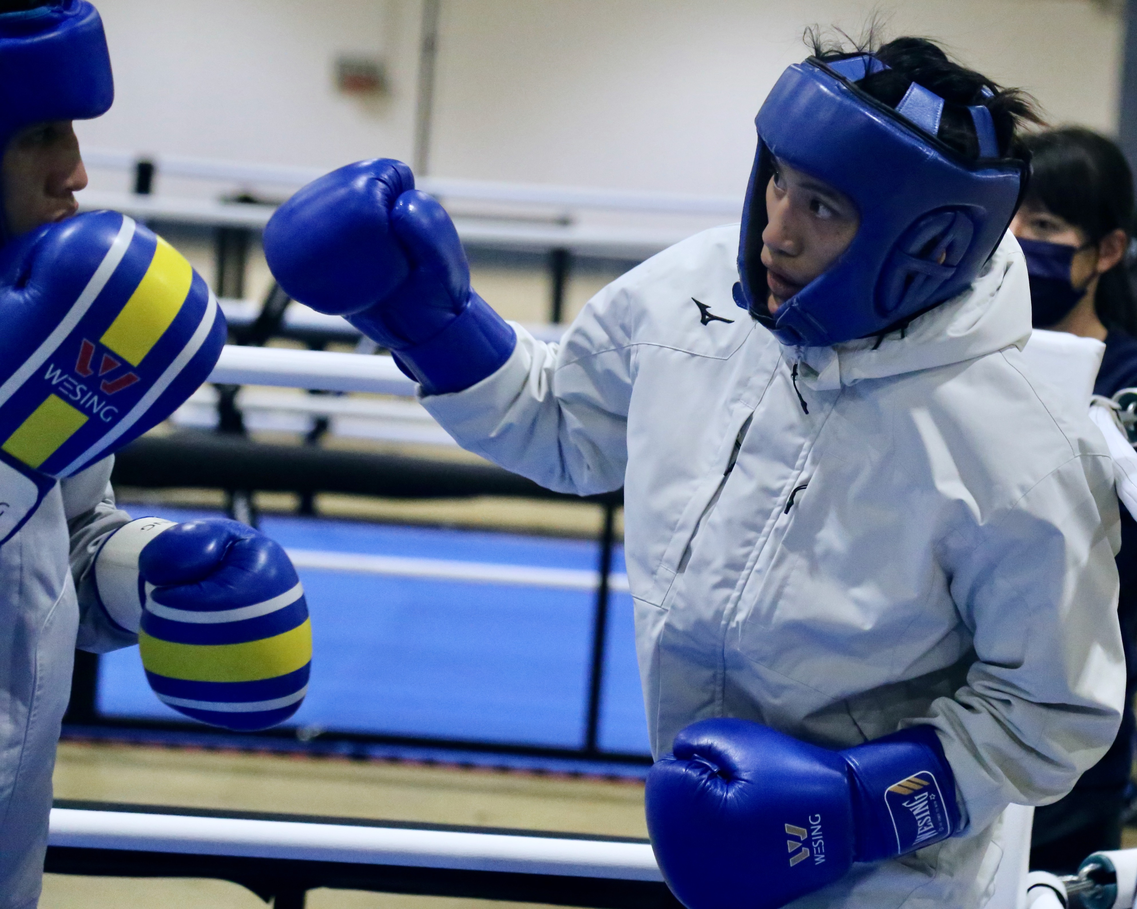 黃筱雯(右)在巴黎奧運世界資格賽大會指定場地訓練。(中華民國拳擊協會提供)