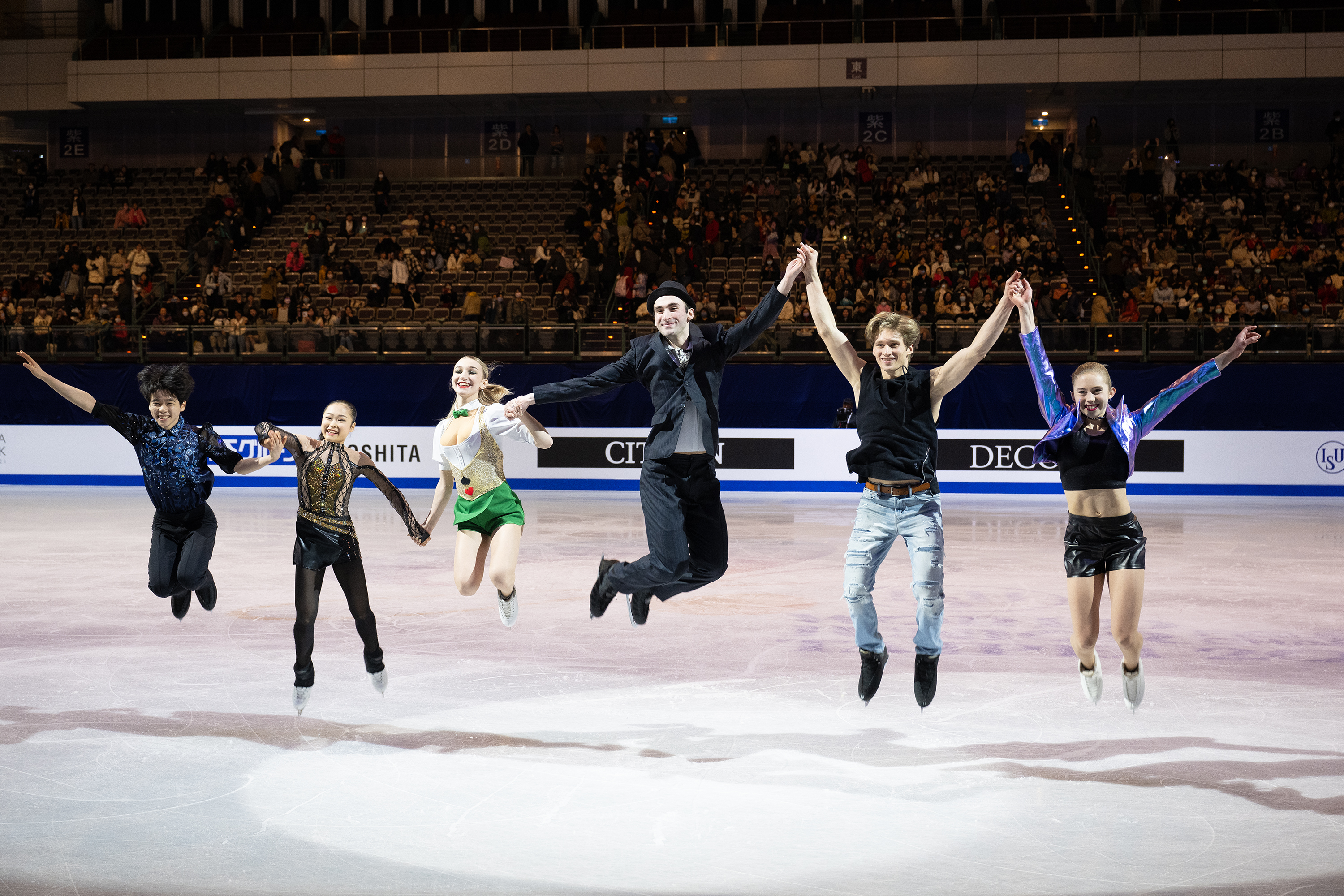 本屆世青賽各項金牌選手在閉幕表演達冰迷,左起徐玟圭、島田麻央、Anastasilia Metelkina、Luka Berulava、Artem Markelov、Leah Neset。(中華民國滑冰協會提供)