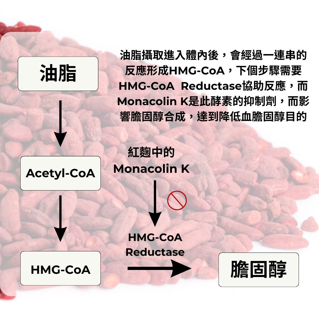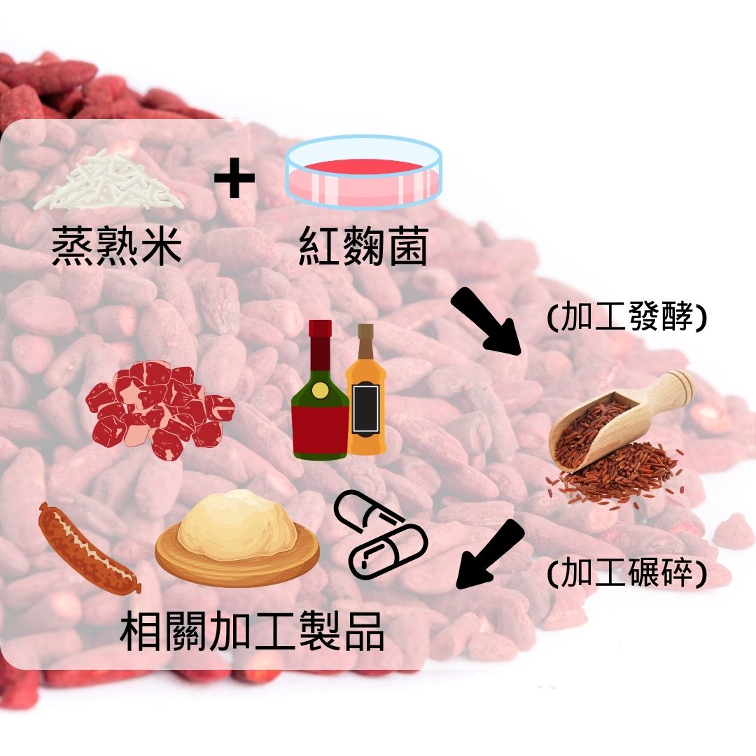 紅麴是由米煮熟之後,加入紅麴菌,在控制時間及溫度下發酵而成,此時就是我們所知道的紅麴,接著會再加工將其碾碎,變成紅麴粉末,進而做成各式各樣的紅麴相關產品。而紅麴的製作過程中,會產生許多衍生物,當中Monacolin K是紅麴這項產品靈魂般的存在,市售紅麴全靠它才得以有如此神奇的效果。