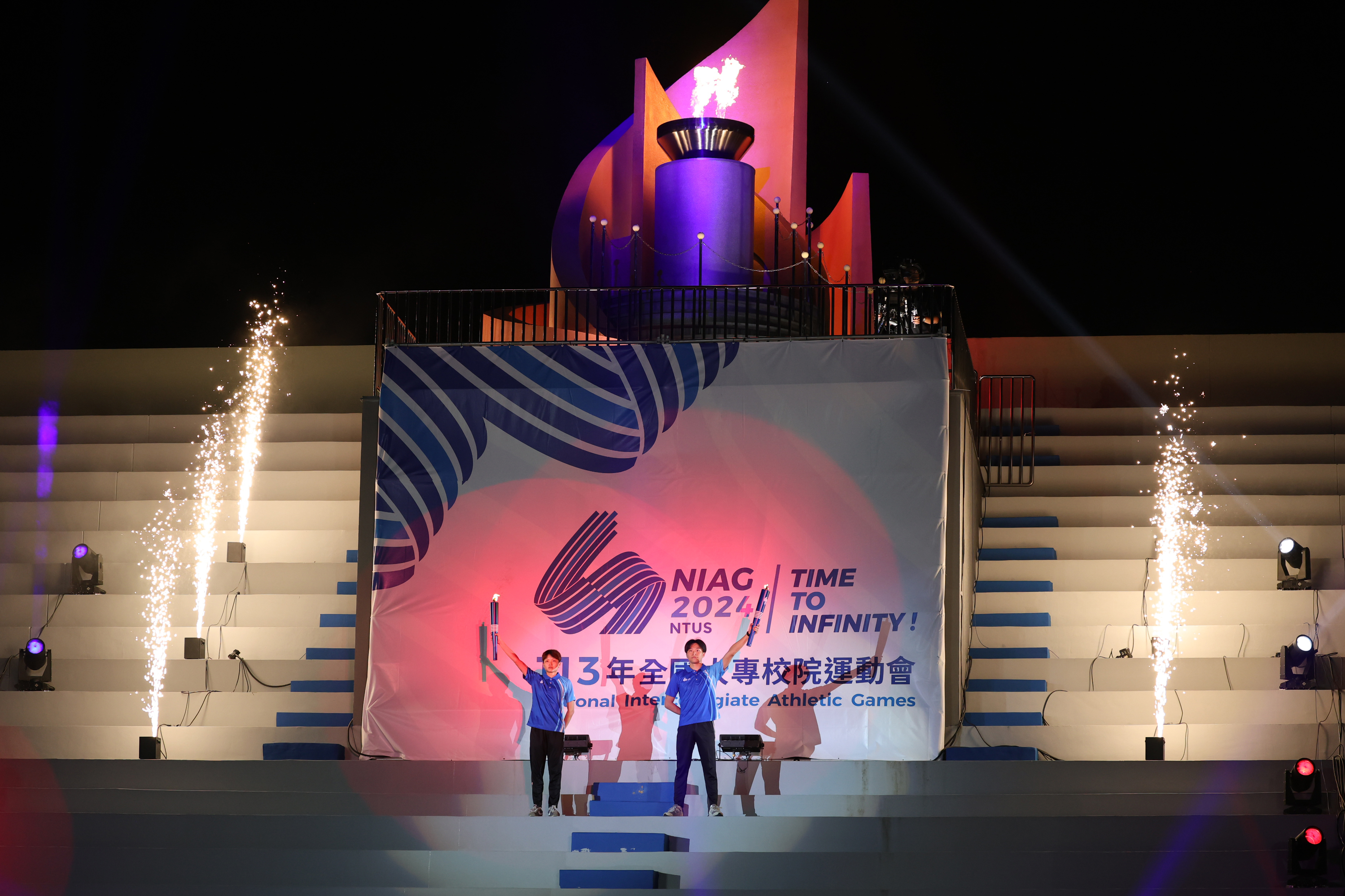 張喬茵(左)、黃唯鑫(右)共同擔任最後1棒聖火手。(113年全國大專校院運動會提供)