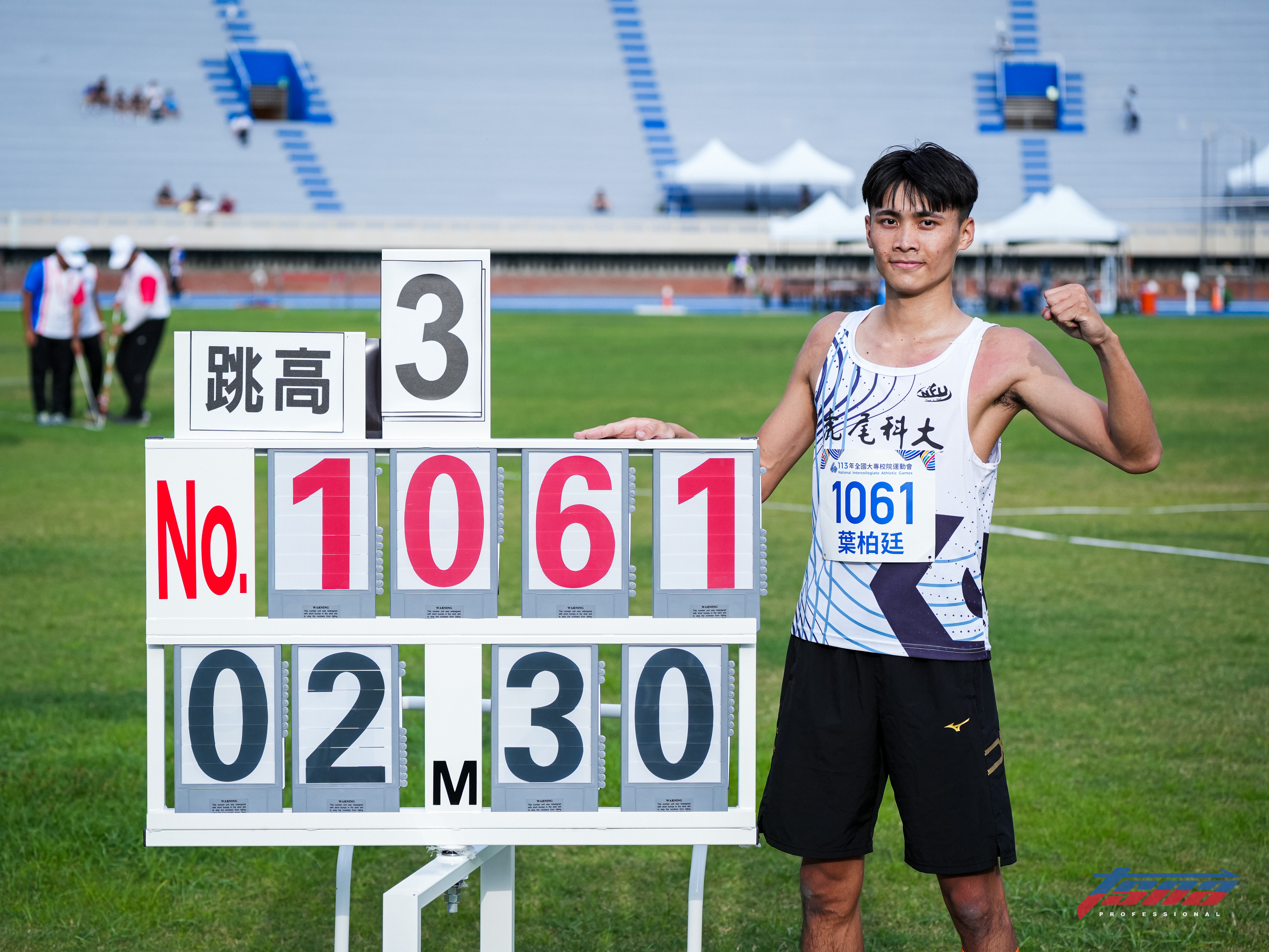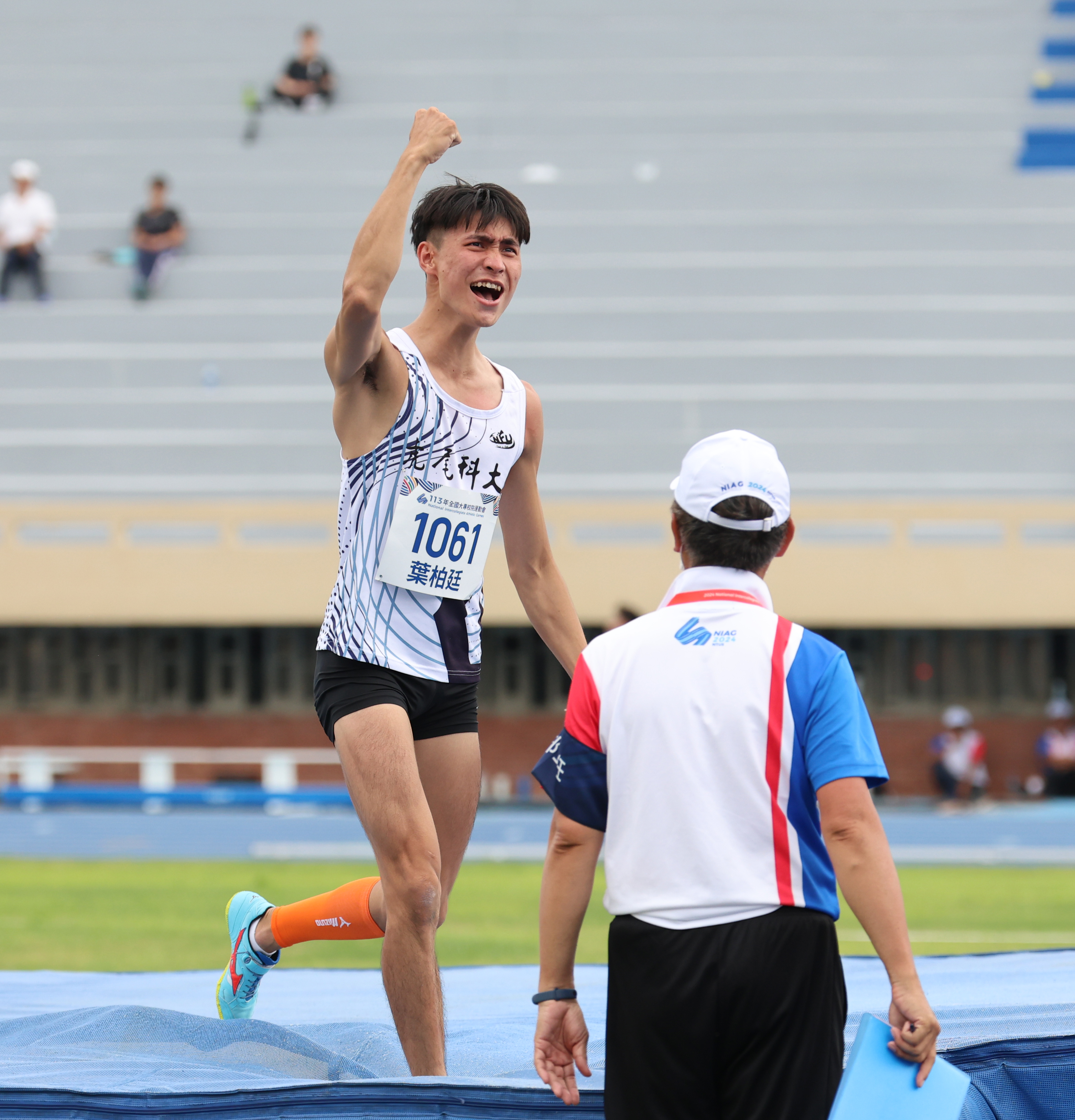 繼5/4臺灣師範大學莊盛閔舉重男子73公斤級抓舉、總和雙破全國後,113年全國大專校院運動會田徑場今天也誕生全國紀錄。虎尾科技大學葉柏廷在2公尺30試跳2次失敗後,第3跳一躍而過,打破自己奉為榜樣向俊賢在104年全國運動會所締造2公尺29全國紀錄,他除感謝家人與學校外,也透露成績來自運動科學、師長心靈雞湯雙重輔助。