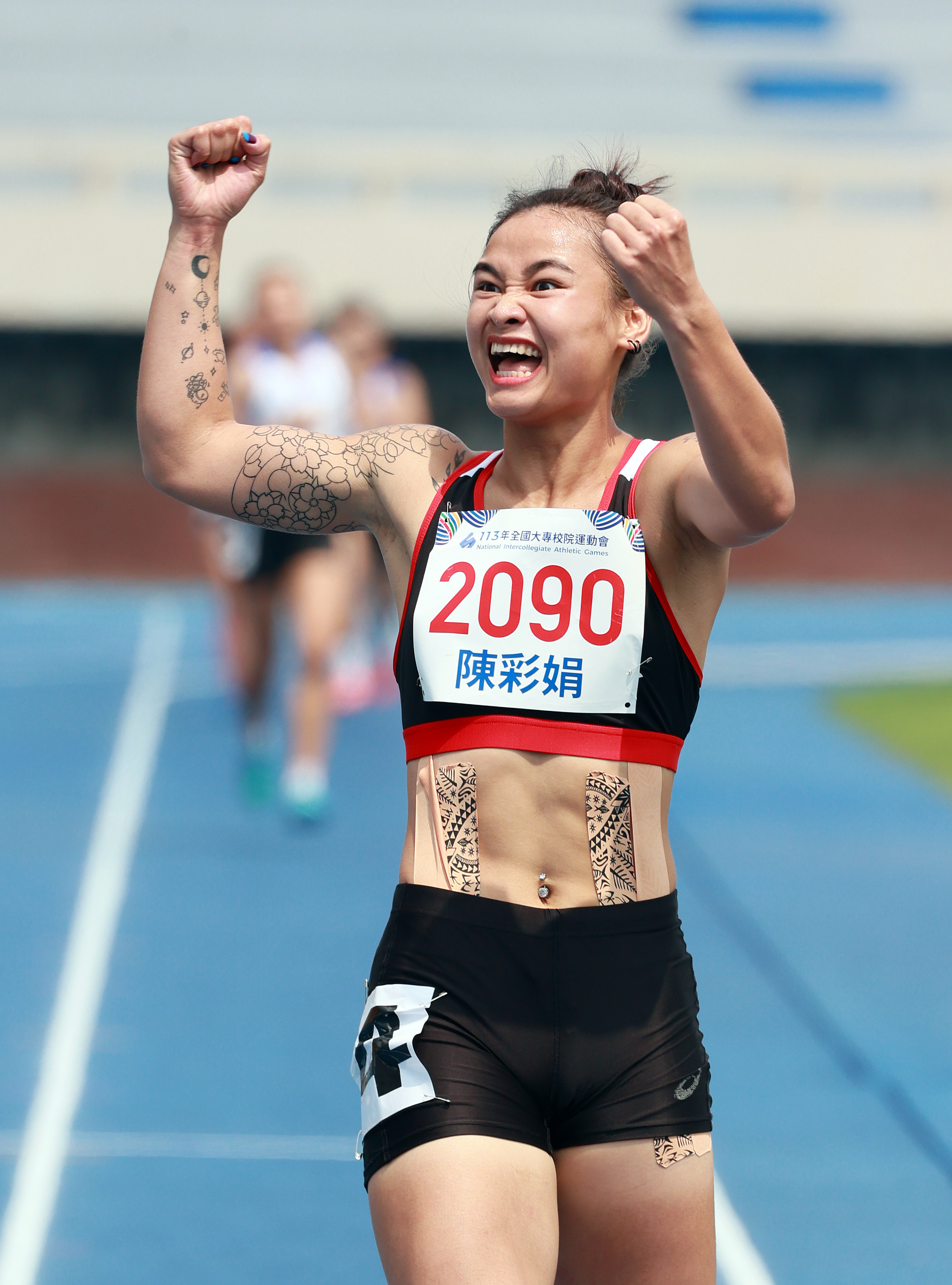 陳彩娟跑完800公尺後確定破紀錄相當興奮。(113年全國大專校院運動會執行委員會提供)