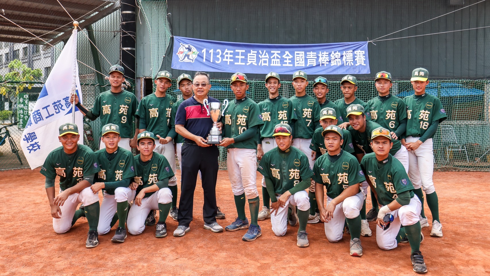 高雄市代表隊大部分由高苑工商棒球隊所組成,4月才剛傳出噩耗,王維中的恩師鄭英俊在接任高苑工商總教練1個月後被發現台東飯店內猝逝,享年67歲,今天高雄代表隊在王貞治盃就為教練拿下相隔23的冠軍金盃。