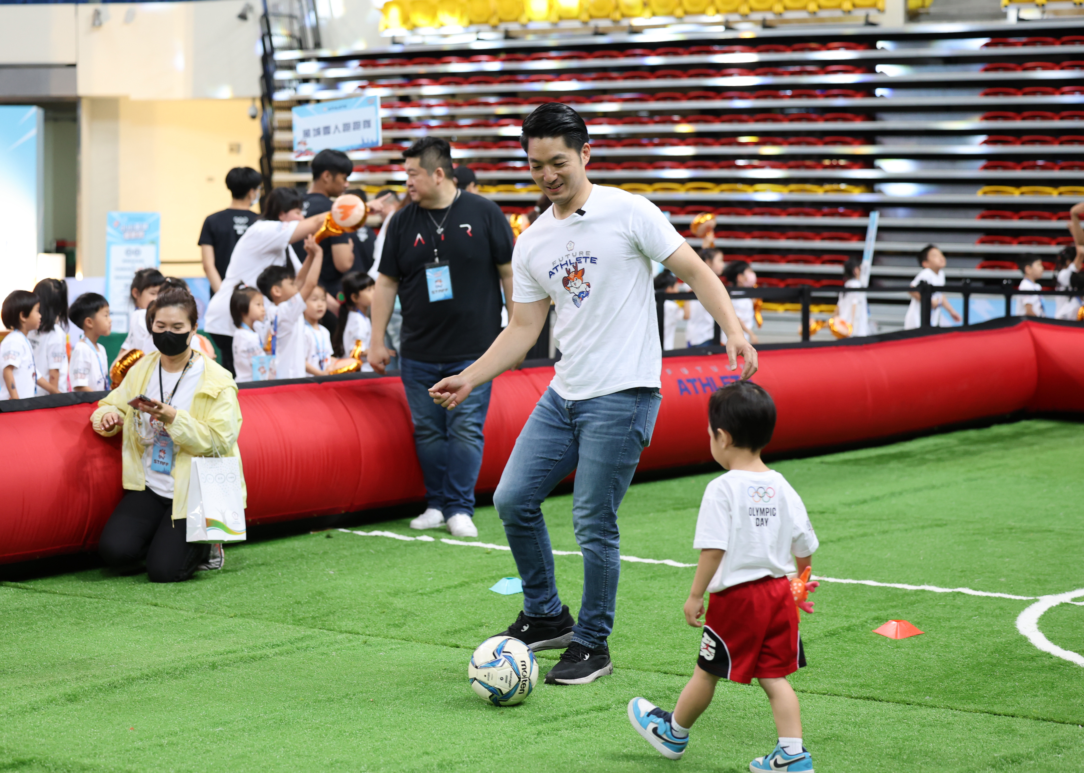 鄭文燦期許小朋友享受運動,保持運動習慣,並與小小運動員們互動,詢問今年奧運舉辦城市,並邀大家在巴黎奧運一起為中華隊加油。蔣萬安笑稱,帶著二寶參加,除了讓孩子培養運動習慣、認識運動,也可以讓妻子負擔輕一點。