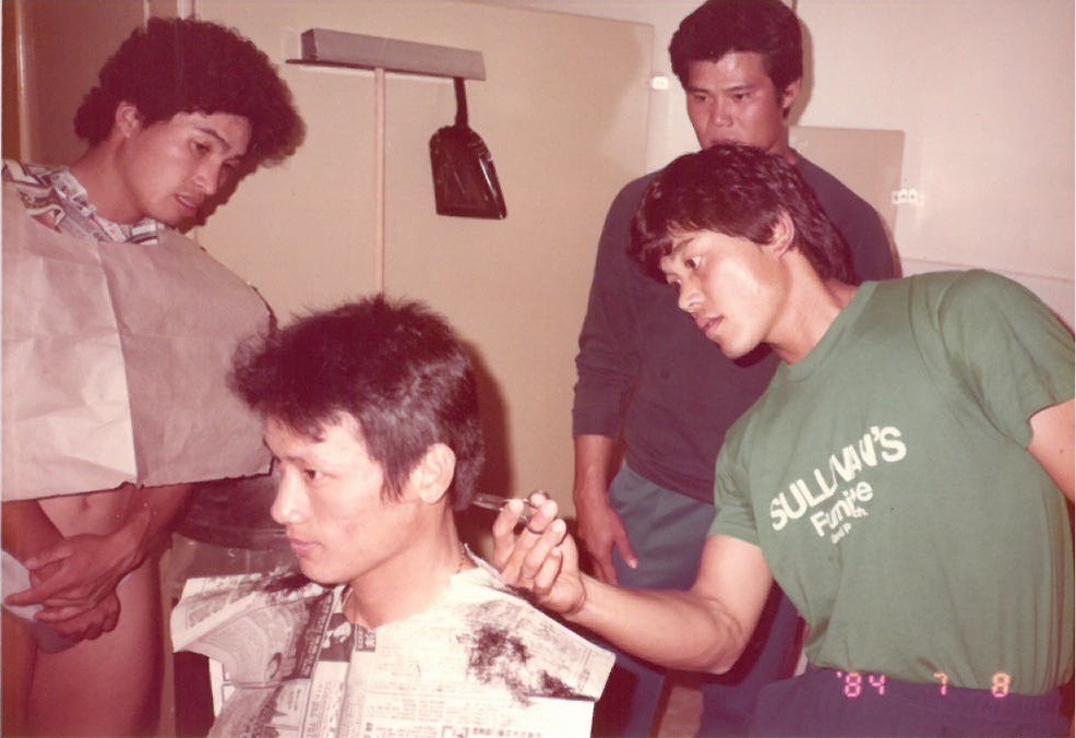 中華隊赴美備戰1984年奧運時,曾智偵(右)在飯店幫郭泰源剪髮,李志俊(右2)與吳德生(左)站在一旁觀看。葉志仙提供