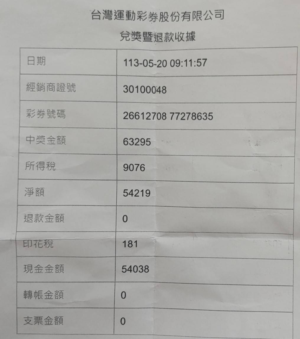 她的5關全過那一注倍數相乘達到1793倍,3場正確比數賠率相乘有604倍,加上5組4關都超過500倍,這7注需要扣稅。扣稅不像台彩「超過5000元要扣稅+印花稅」,運彩是投注倍數超過500倍需要扣20%的稅+印花稅。所以小美眉票面上中獎金額63295元,實際去銀行,扣完稅後領到54034元。