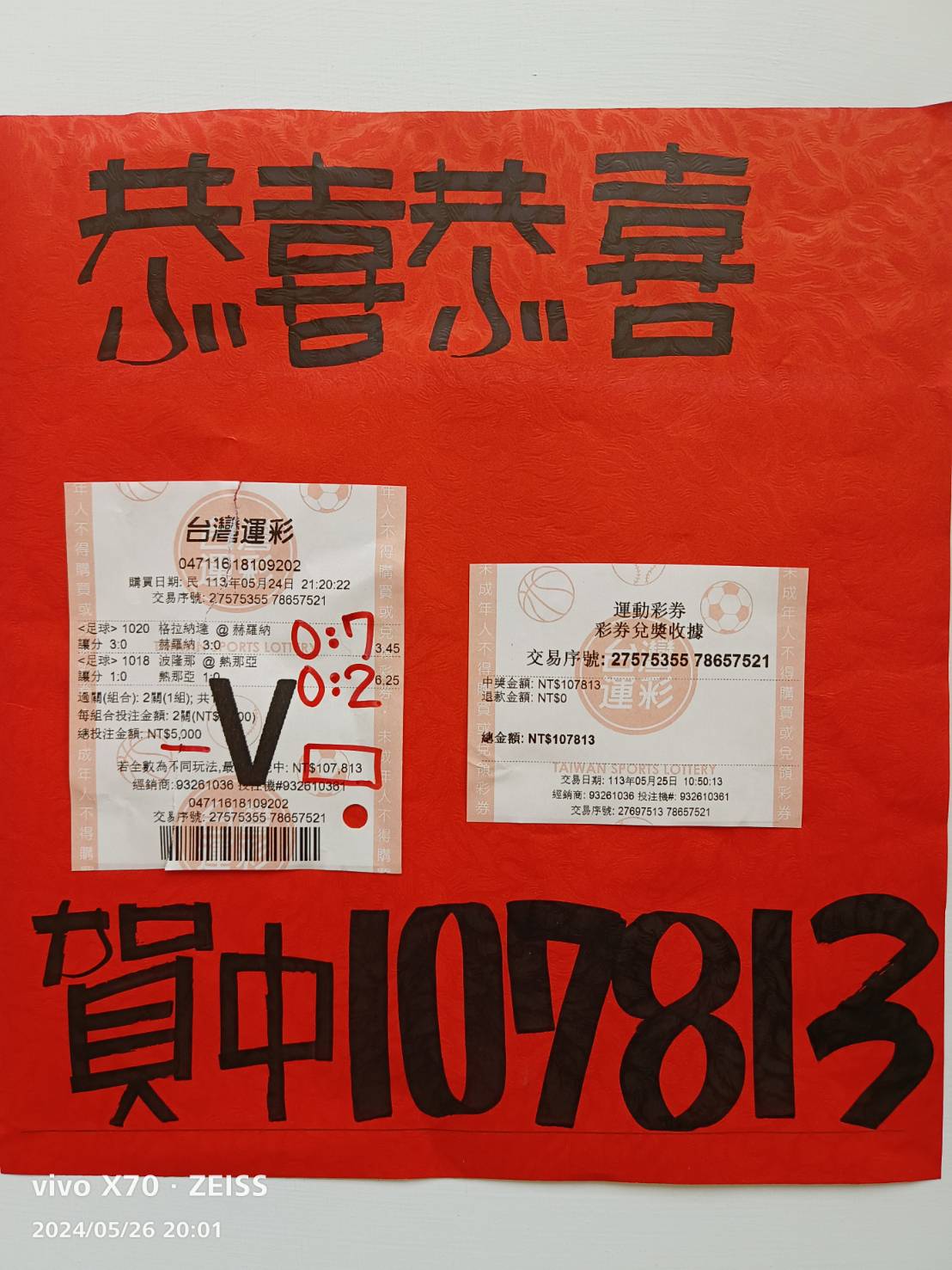 彩迷朋友串2關義甲,實領107813元彩金。高雄「通通過運動彩券行」提供