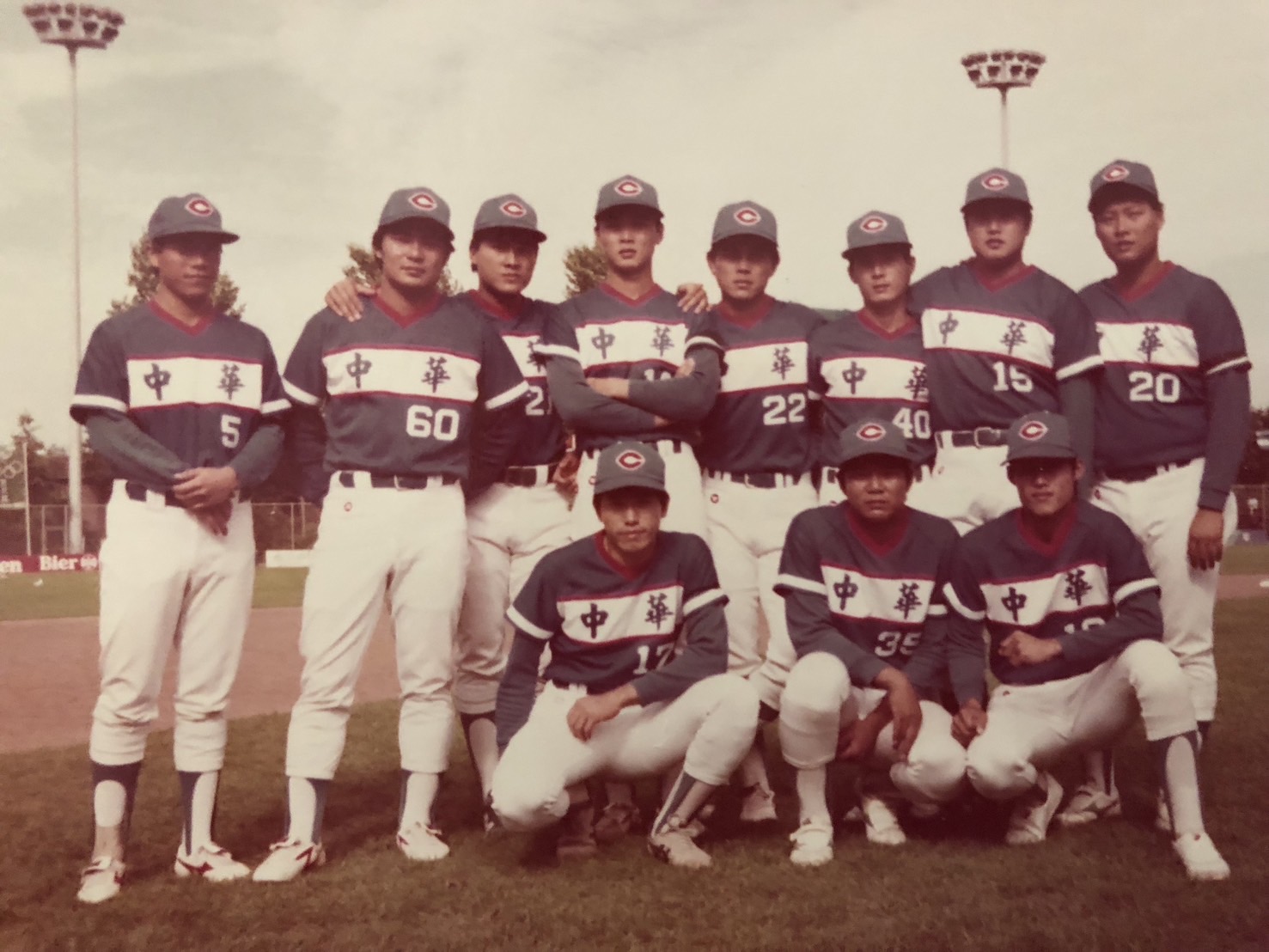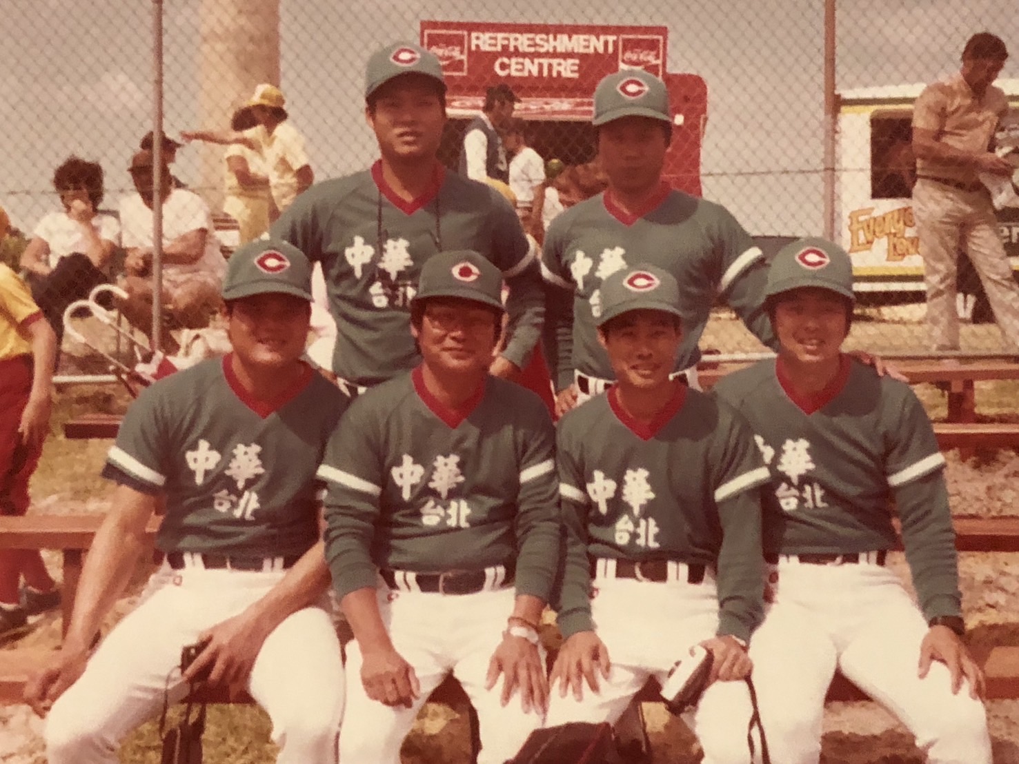 1984年奧運結束後,杜福明(後排左)於11月入選中華盃國際棒球邀請賽,與中華隊總教練吳祥木(前排左2)、光華隊總教練杜勝三(前排右2)等成員合影。杜福明提供