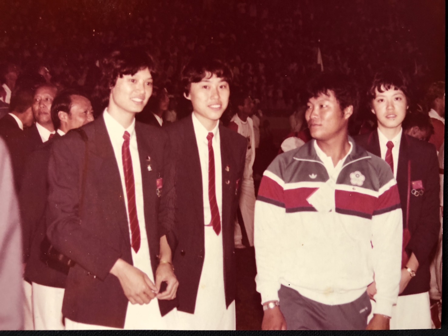 杜福明在洛杉磯奧運會開幕典禮,與大陸女排國手合影。杜福明提供