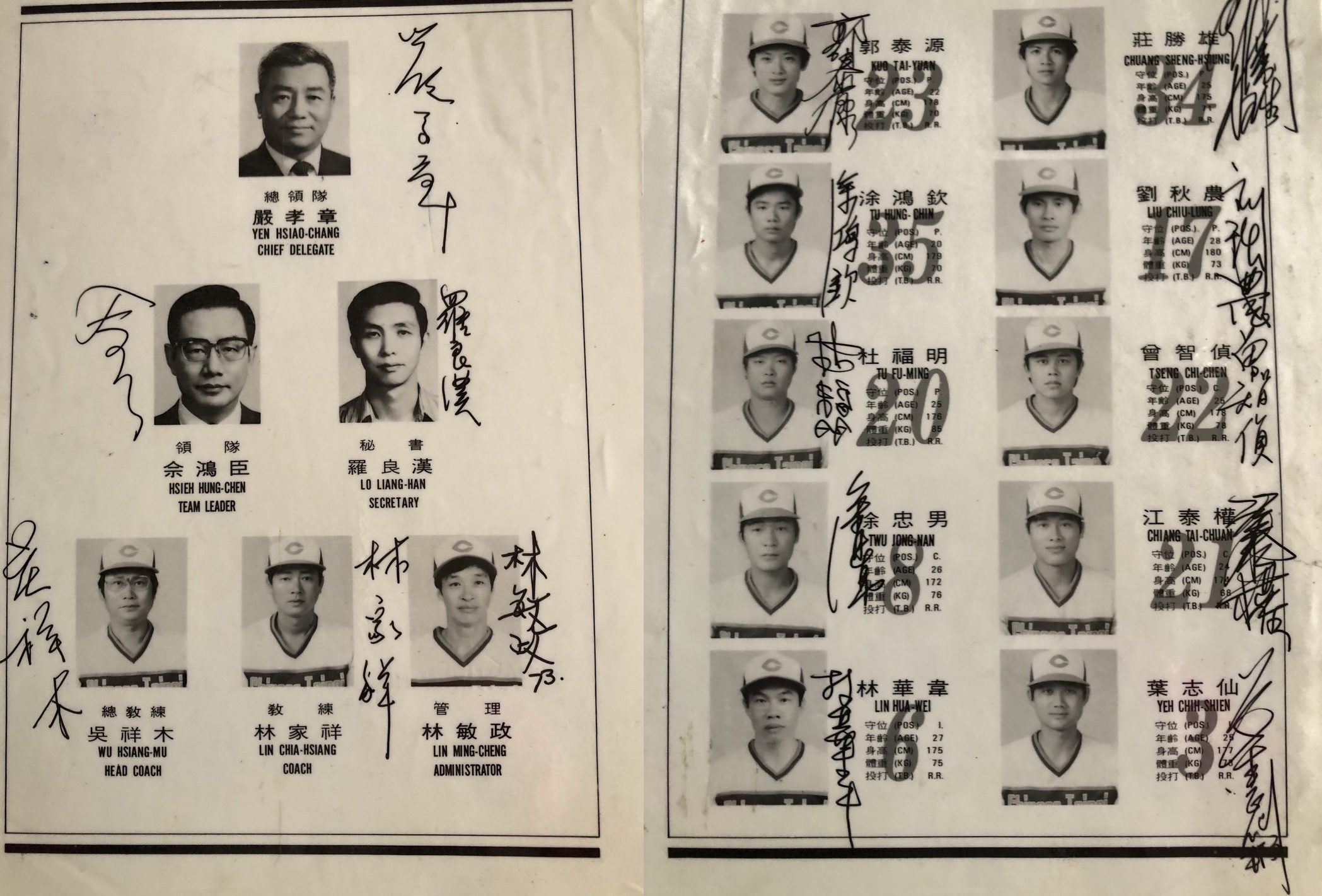 4杜福明仍保留中華隊進軍1984年洛杉磯奧運的隊職員名冊,還請大家簽名留念。杜福明提供