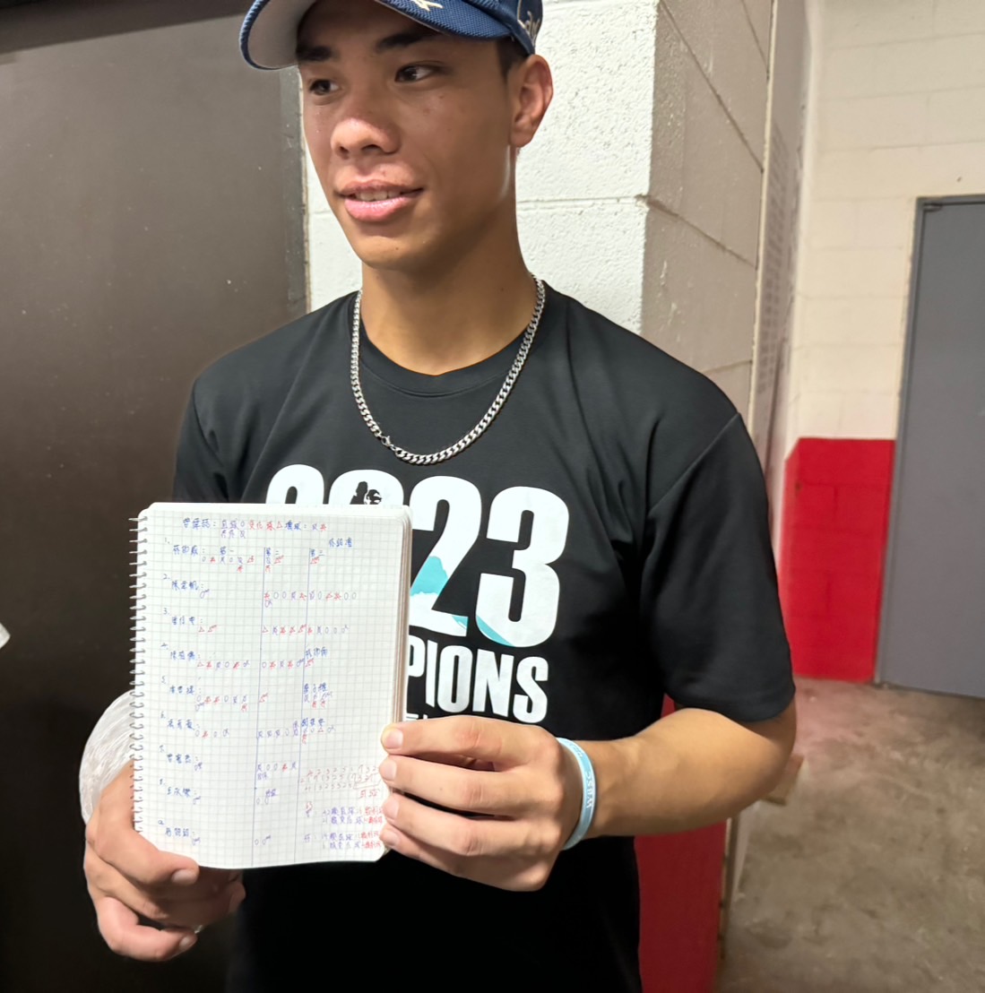 談到開轟打席,柯敬賢也說自己當下有刻意要抓直球攻擊,「那時候是2好3壞,我們這個年紀滿球數不太會丟變化球,想說直球抓前面一點。」在四強賽開始準備筆記的柯敬賢,今天也會繼續觀察對手。筆記本內除了可能面對的投手投球內容外,他也有紀錄自己的全壘打數,以及比賽後的成績、缺點還有心得及改進方法。