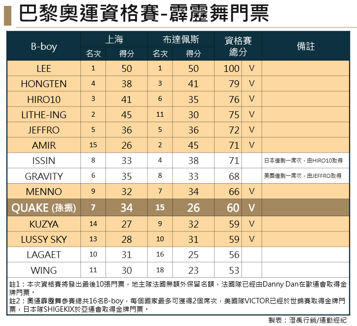 一肩扛下台灣霹靂舞界站上奧運殿堂的期待與壓力,「全村的希望」霹靂舞國手孫振(B-Boy Quake),在奧運資格系列賽最後一場布達佩斯站賽事,最終雖止步16強小組循環賽,但仍以排名第15名進帳26分積分,加上5月上海站第7名的34分,以總積分60分、第8順位取得巴黎奧運門票。