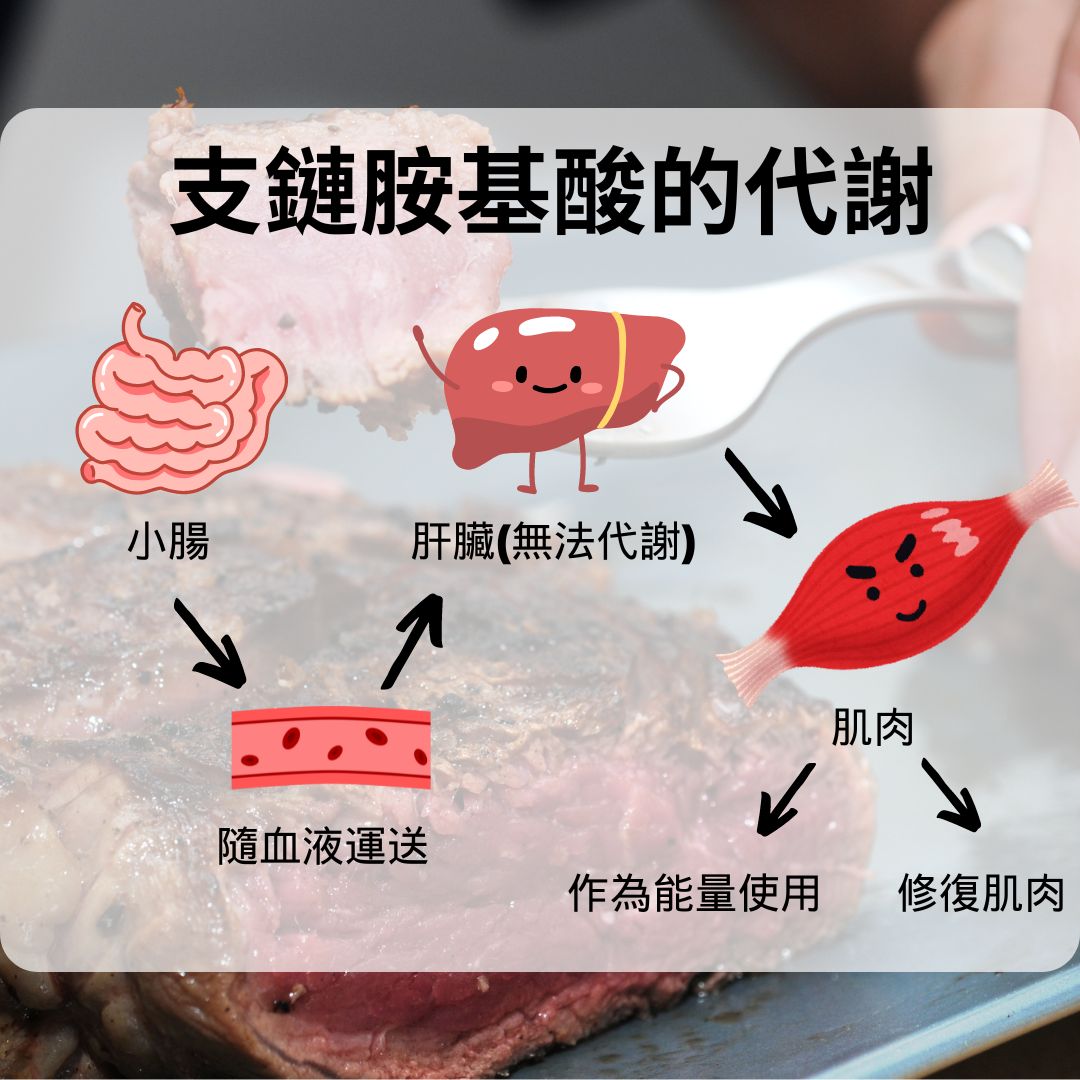 當我們攝取蛋白質時,蛋白質進到體內會先分解成胺基酸,其中就包含了支鏈胺基酸(白胺酸、異白胺酸、纈胺酸),由於肝臟缺乏這三種胺基酸的代謝酶,因此會直接由肌肉去代謝吸收,「並且於訓練前後都攝取,可以有效的修復肌肉,並且降低訓練後肌肉痠痛的感受。」