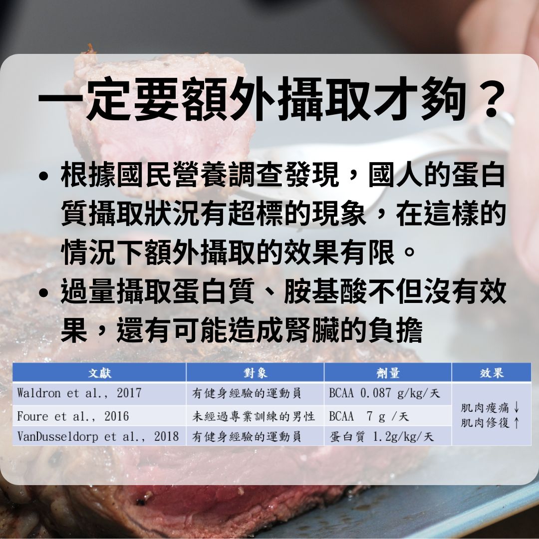 雖然上一段講到有可能會吃不夠,不過因為我們的日常飲食都會攝取到蛋白質,在加上根據國民飲食調查發現,國人的飲食習慣幾乎不太可能會缺蛋白質,因此在攝取支鏈胺基酸上也不太需要擔心會有補不夠的問題,然而以彥褆營養師的經驗來看,即便是這種幫助肌肉修復的營養品,在平常訓練時也要提前開始使用,避免在比賽緊要關頭時,因為身體不適應,導致競技狀態下滑,造成反效果唷!