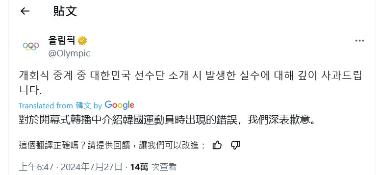 國際奧會為播報失誤致歉。(擷取自國奧會x).jpg