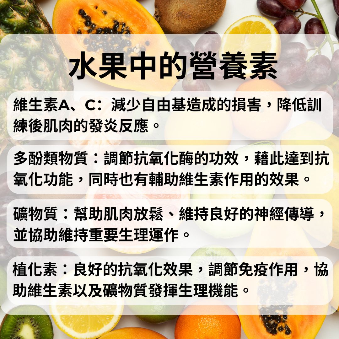 不論是長期處於高壓訓練的選手們,或是下班後自律到運動場報到的素人,除了有良好的休息以外,相信大家對於吃什麼可以幫助疲勞恢復、保護訓練後疲憊的身體不受風寒,一定特別的有興趣,而水果剛好有符合這些需求的要素,不論是水果中富含的維生素C、多酚類物質、植化素以及其他礦物質,都可以有效的幫助身體的恢復、減緩發炎反應,趕快來看看水果中有哪些好東西~