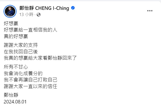 沉澱過後鄭怡靜也在社群發文,「好想贏,好想贏給一直相信我的人,真的好想贏,謝謝大家的支持,在我找回自己後,我真的想贏給大家看鄭怡靜回來了,所有不甘心,我會消化成養分的,我不會再讓自己打敗自己,謝謝大家一直以來的信任,鄭怡靜,2024.08.01。」