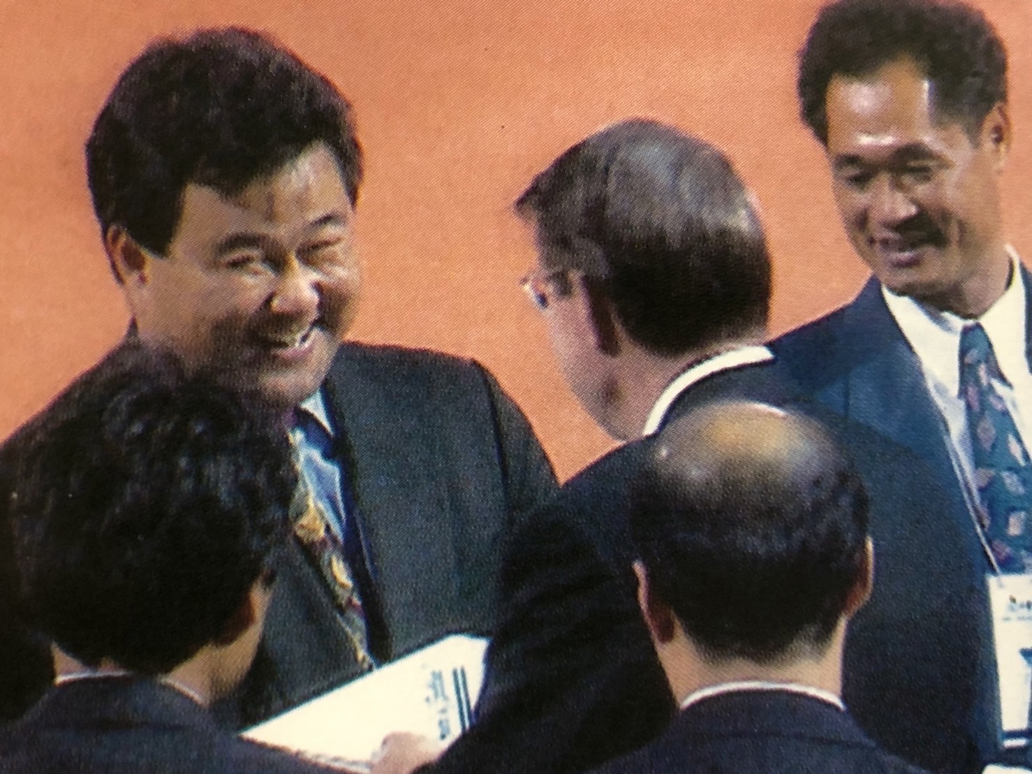 1993年道奇老闆歐馬利(背對鏡頭者)率隊來台灣打交流賽,與趙士強握手致意。趙士強/提供