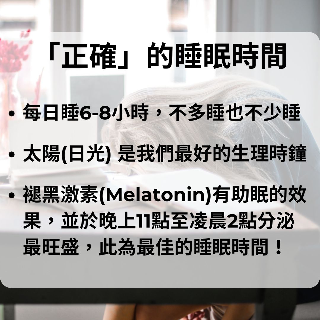 首先是有良好的作息,人類是「日出而作,日落而息」的動物,太陽是我們校正生理時鐘的依據,並且每天平均的睡眠時間落在6-8小時,重點是!是在對的時間去做睡眠,根據研究發現,人體中幫助我們有良好睡眠的分泌物「褪黑激素」,主要是在晚上十一點至凌晨兩點時分泌最旺盛,因此我們盡量在這之前有良好的睡眠,讓身體確實得到休息。